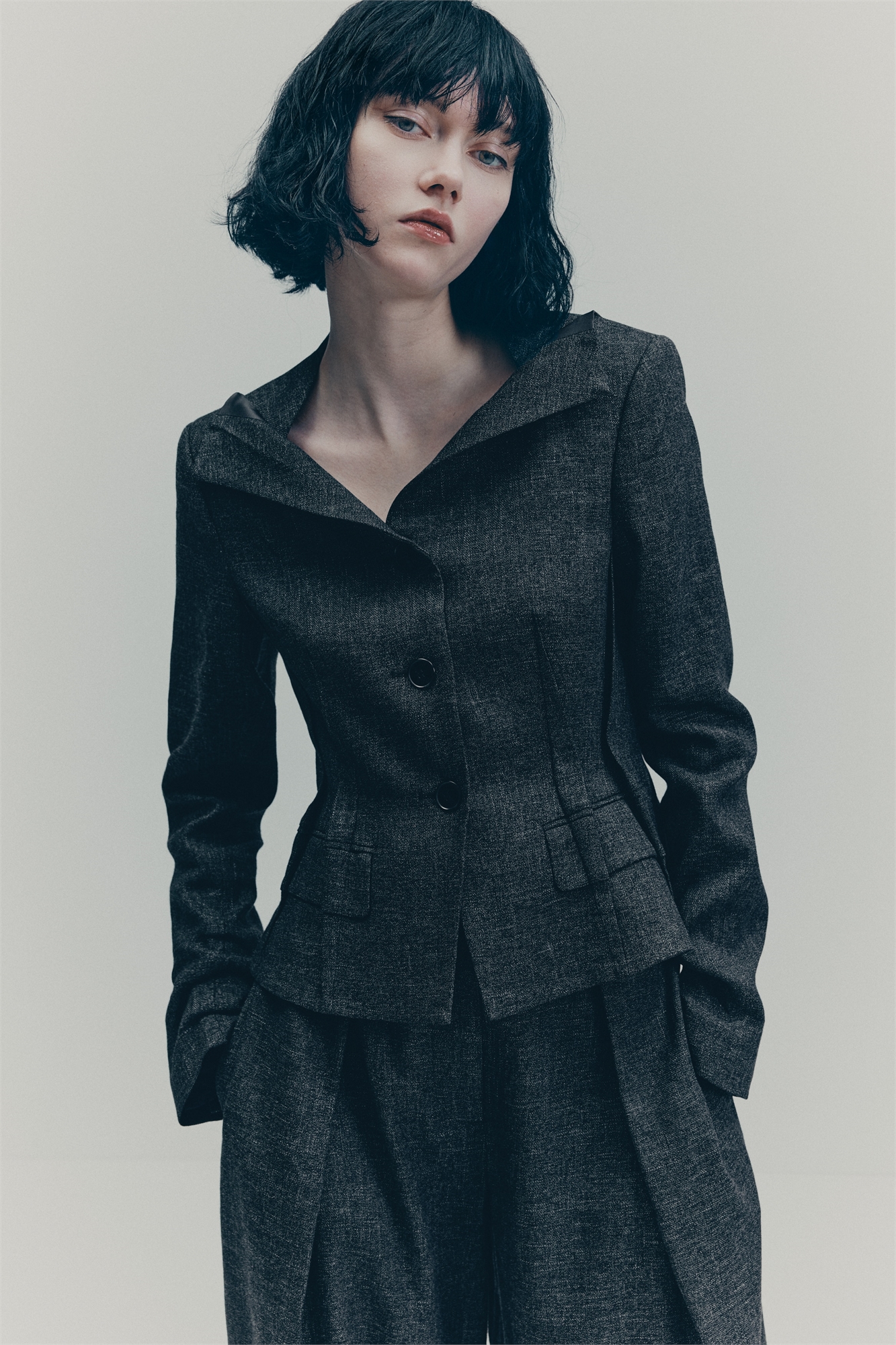 Однобортный блейзер из тканого материала с содержанием шерсти и льна. С отложным воротником и открытыми лацканами со складками. Декоративные втачные передние карманы с клапаном и втачной внутренний карман на пуговице. Плечевые накладки и длинные рукава с рюшами по швам и пуговицами на манжетах. Вытачки по всей длине подчеркивают заниженную талию и силуэт "пеплум". Подкладка из саржи.