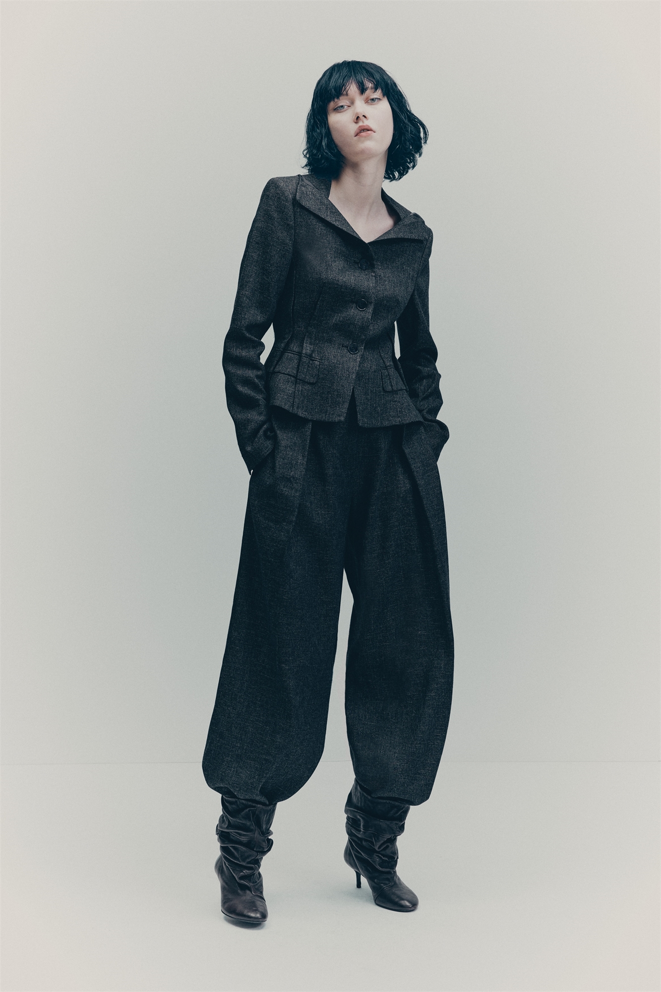 Костюмные брюки свободного кроя из тканого материала с добавлением шерсти и льна. Высокая талия с открытыми вытачками сзади, ширинка на молнии и удлиненный пояс со скрытой пуговицей и застежкой на крючок и планку. Незаметные боковые карманы и глубокая складка спереди на ногах для придания объемной формы.