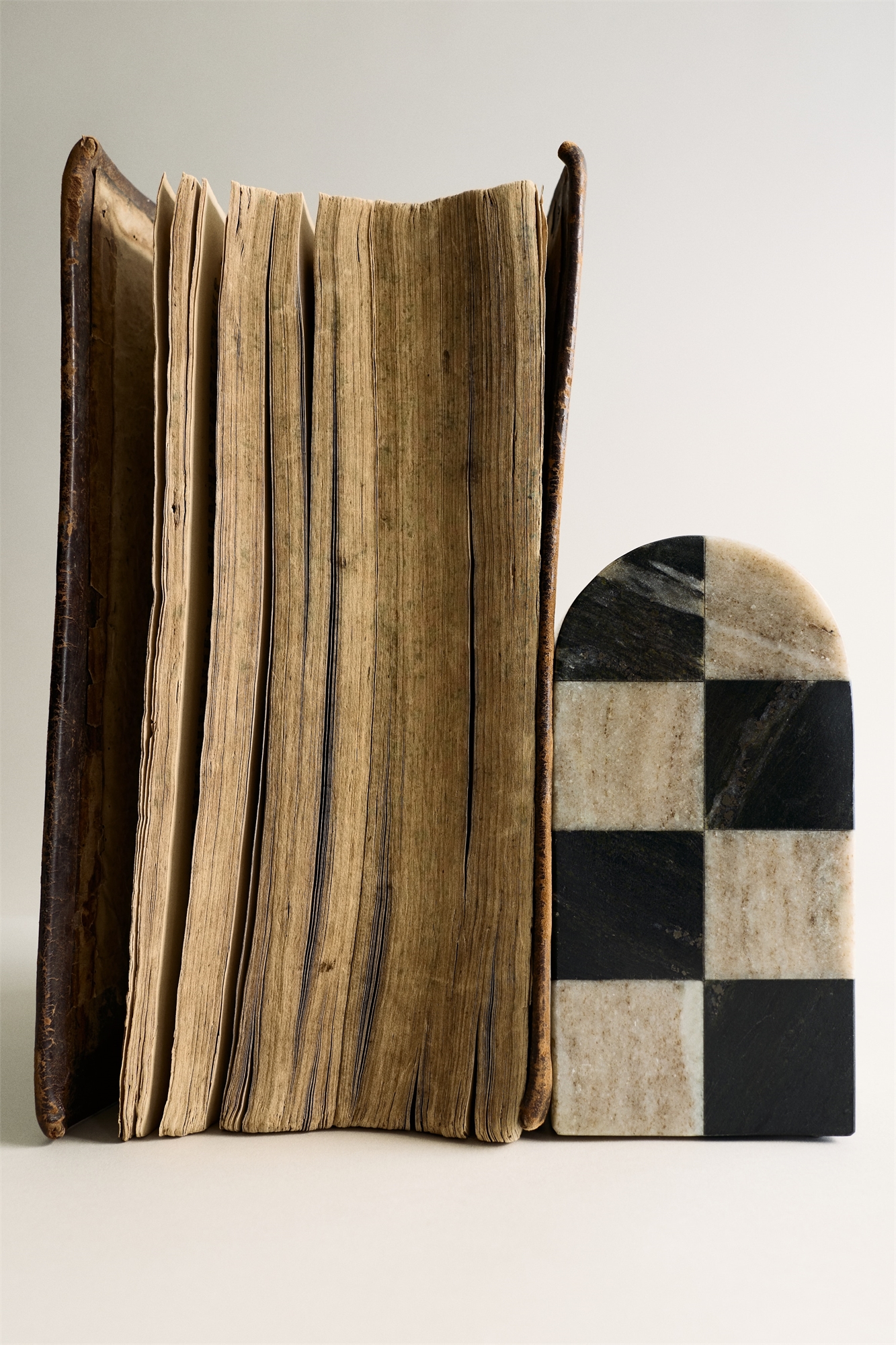 Тяжелая подставка для книг из мрамора с клетчатым узором. Поскольку мрамор является натуральным материалом, цвет каждого изделия может отличаться.