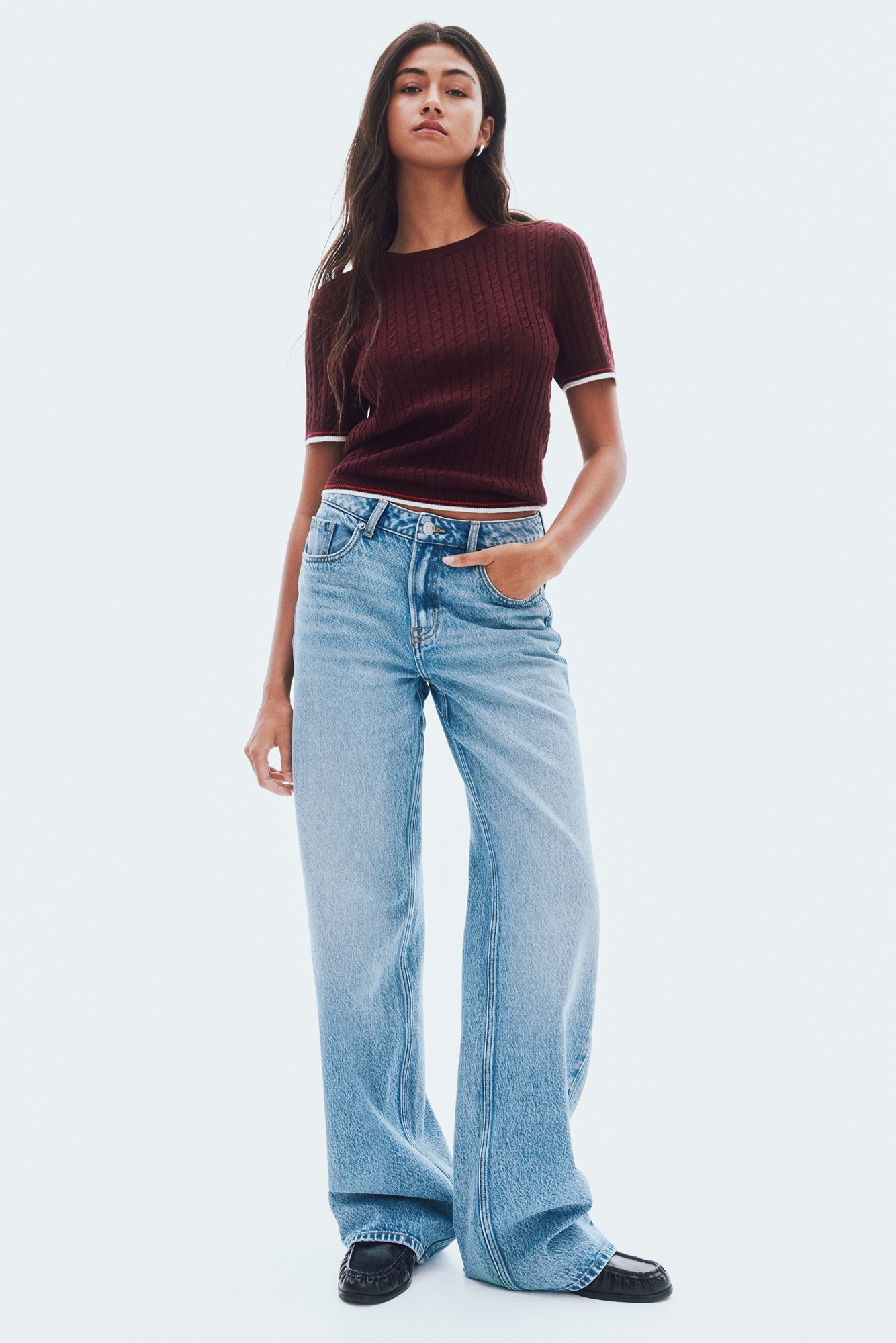 Короткая, облегающая фигуру футболка с передней частью из кабельного трикотажа и задней частью из тонкой вязки. Ребристый круглый вырез и короткие рукава. Ребристые манжеты с контрастными цветными полосками на рукавах и подоле.