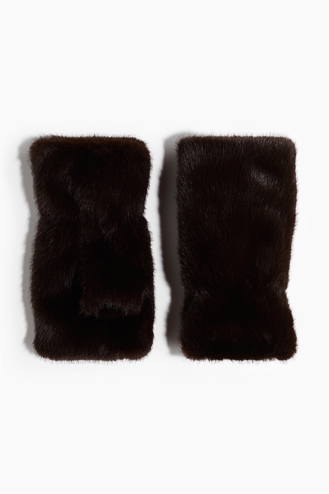 Перчатки без пальцев из пушистой ткани с отверстиями для больших пальцев и узкой эластичной резинкой вокруг запястий. На подкладке.