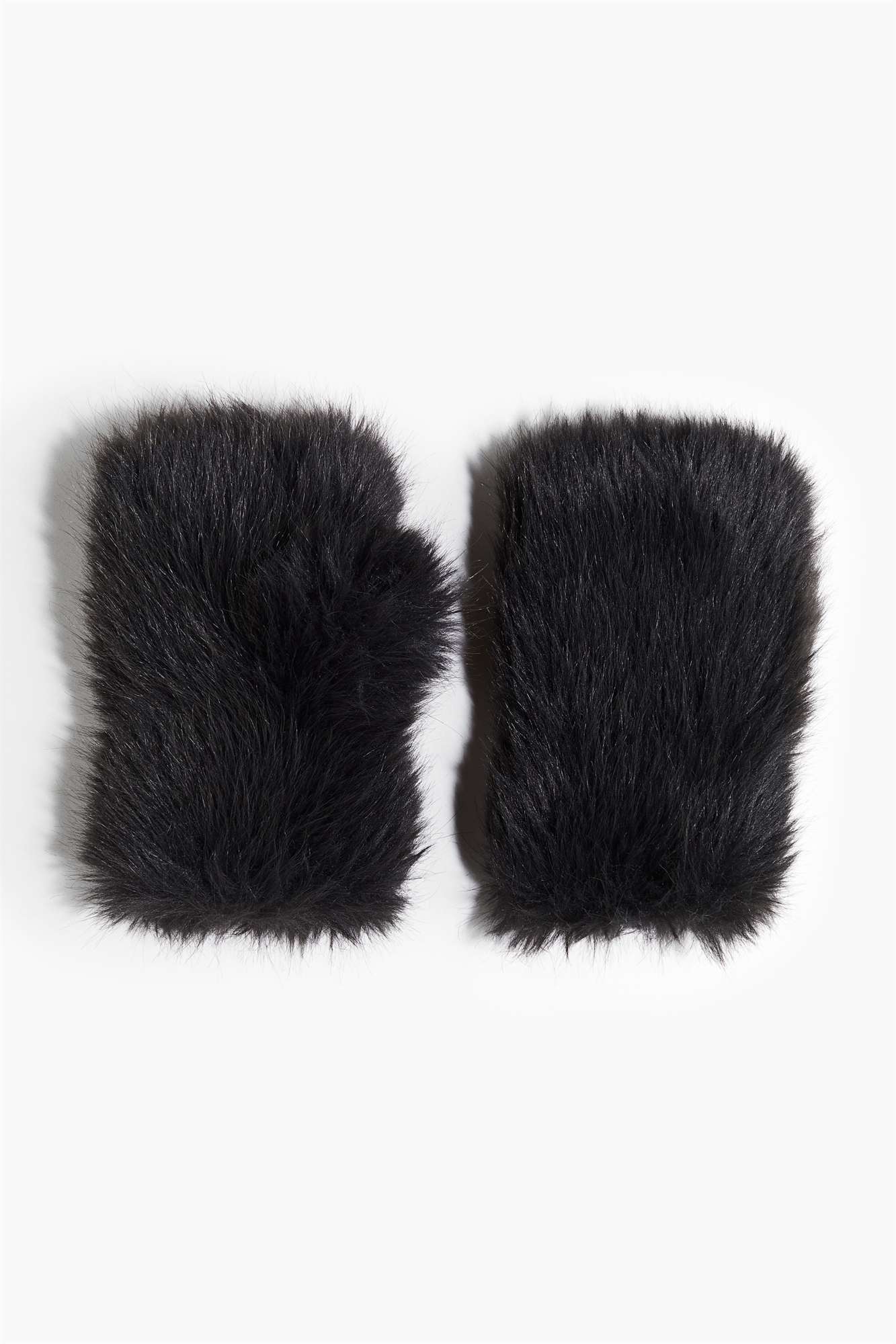 Перчатки без пальцев из пушистой ткани с отверстиями для больших пальцев и узкой эластичной резинкой вокруг запястий. На подкладке.