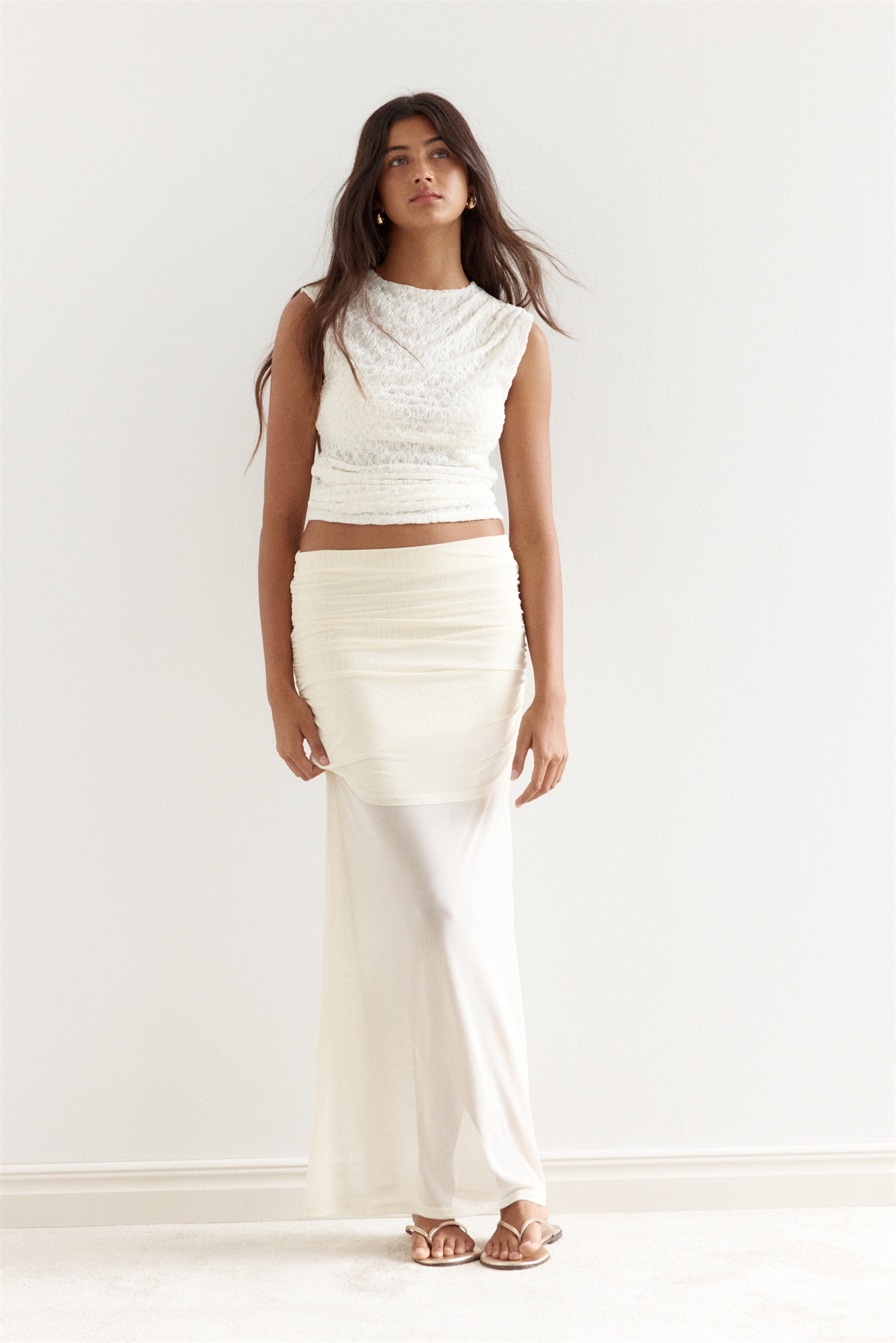 Приталенная юбка длиной до щиколоток из прозрачной сетки. Высокая талия с утяжкой и дополнительным слоем сетки на бедрах с рюшами по бокам для драпировки. Без подкладки.