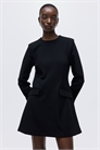 Короткое платье из тканого материала с круглым вырезом, подплечниками и длинными рукавами с разрезом на манжетах. Формирующие вытачки на талии, накладные карманы спереди и расклешенная юбка. Скрытая застежка-молния сзади. На подкладке.