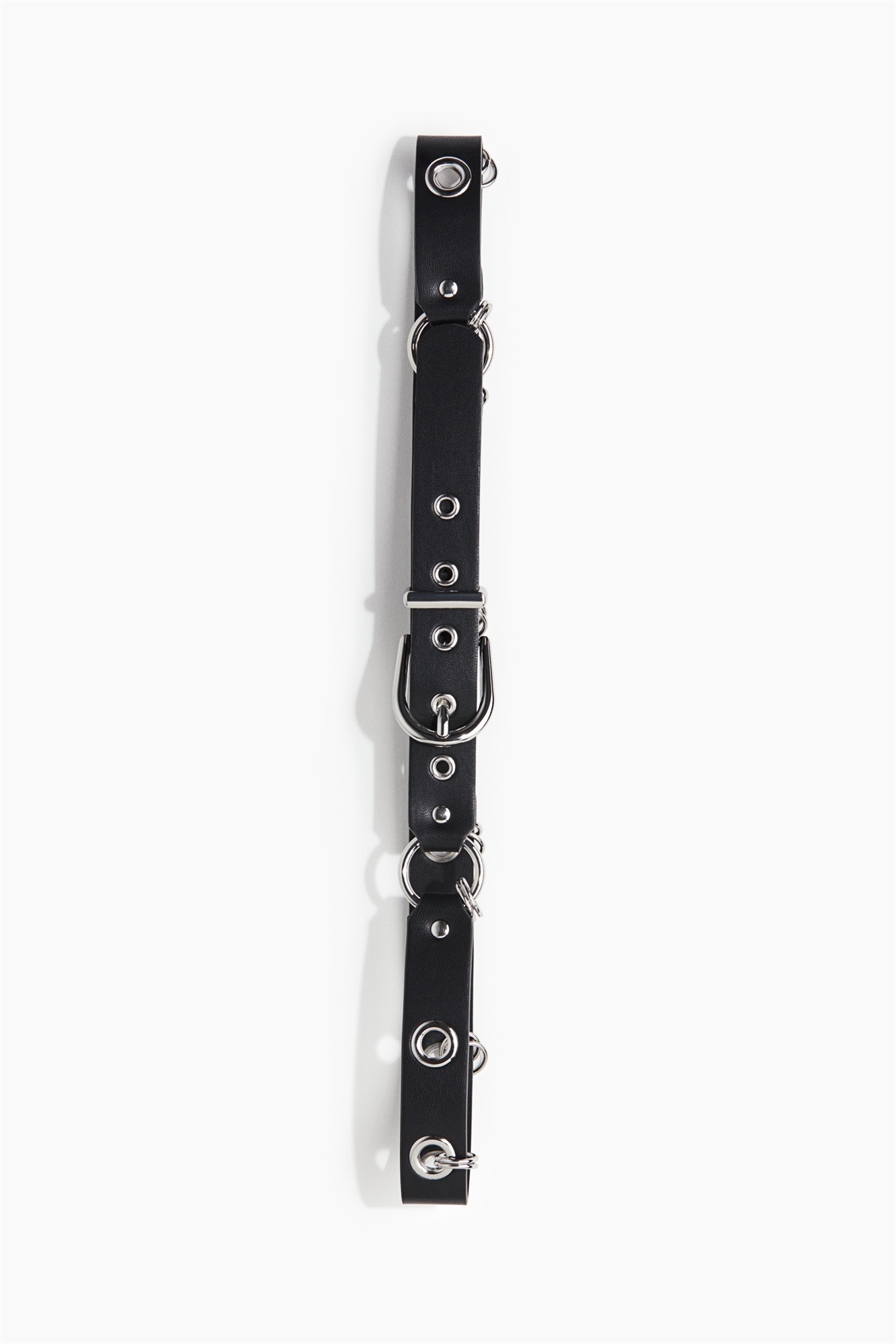 Мелованный ремень с металлической пряжкой и металлическими люверсами по всему периметру, некоторые из которых украшены маленькими металлическими кольцами.