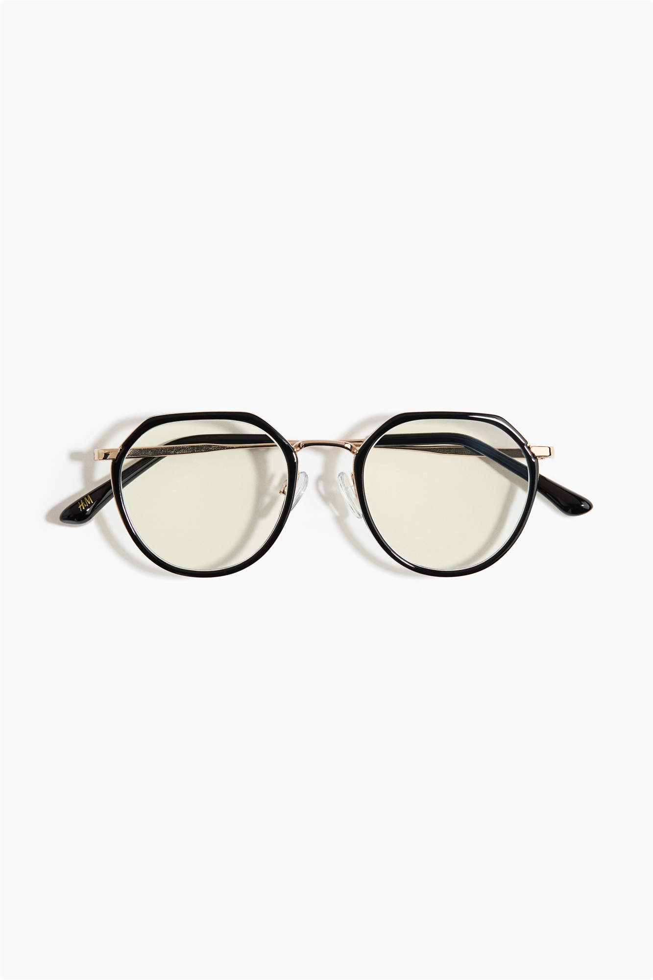 Очки с пластиковой оправой, металлическими дужками и прозрачными пластиковыми линзами. Специальное покрытие на линзах отфильтровывает синий свет от цифровых экранов.