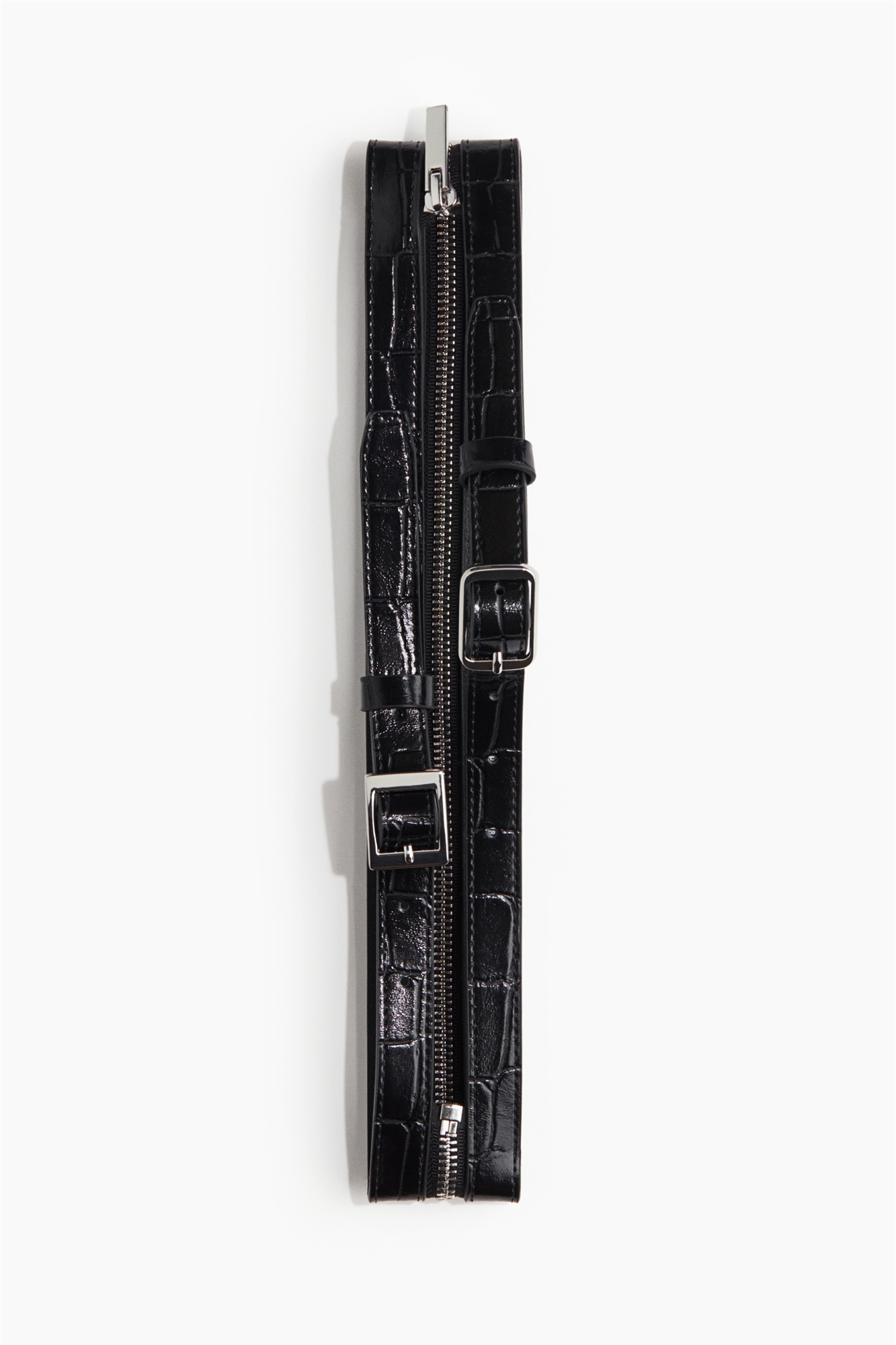 Пояс с двумя ремешками из ткани с покрытием и металлическими пряжками разного дизайна. Два ремня соединяются блестящей металлической молнией.