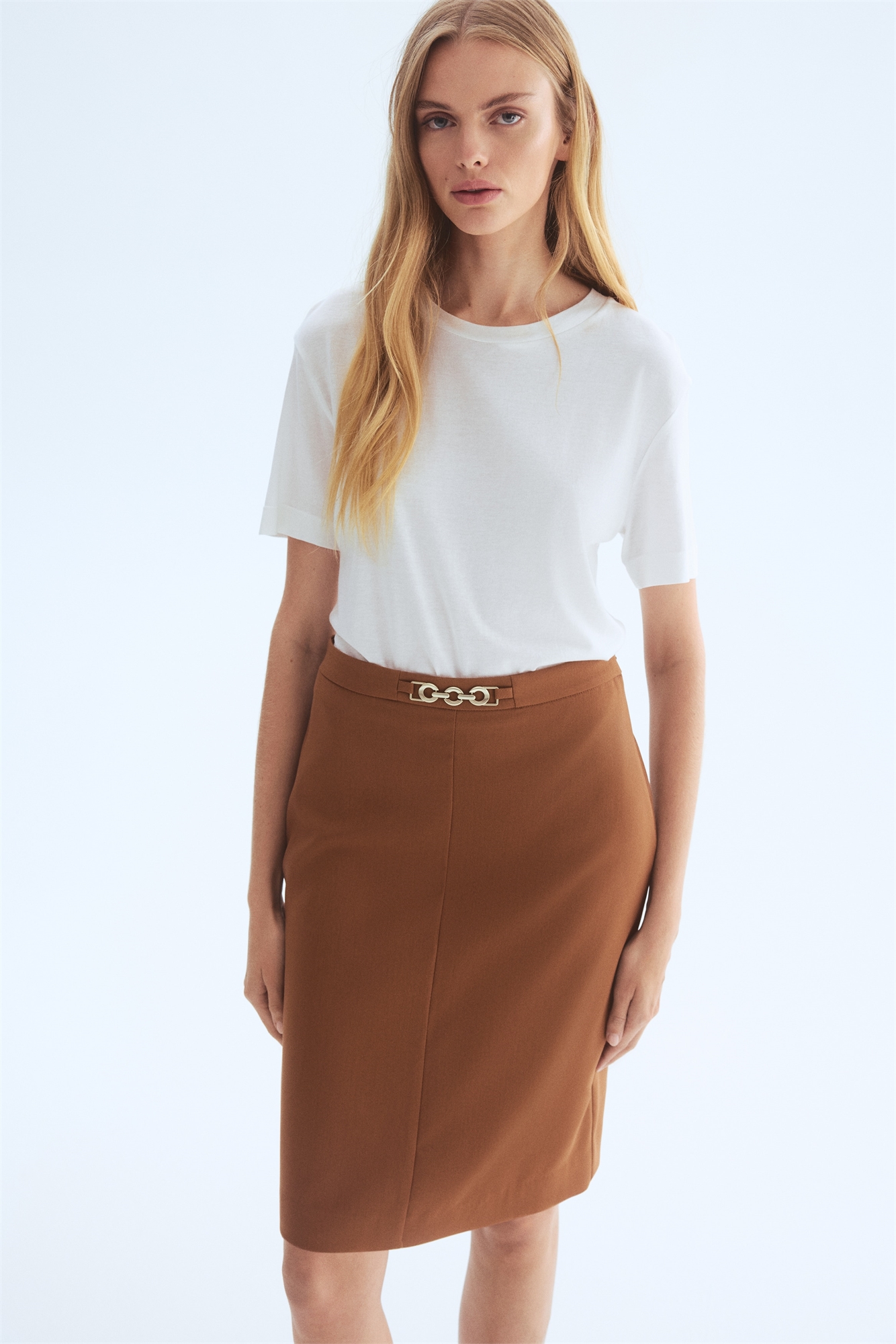 Юбка длиной до колена из тканого материала с высокой талией и декоративной металлической деталью спереди. Скрытая застежка-молния и застежка-крючок с одной стороны. На подкладке.