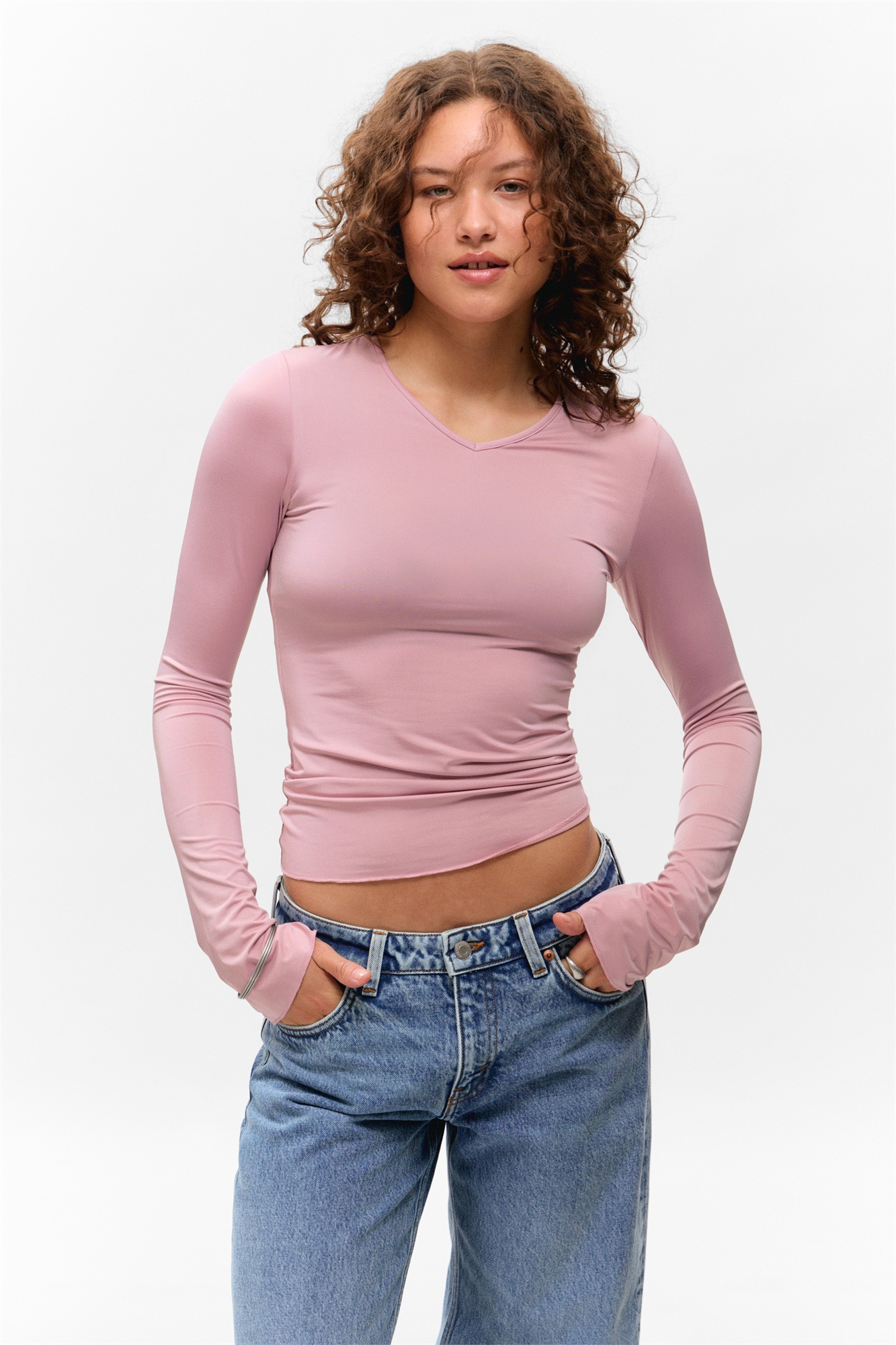 Топ с длинными рукавами, выполненный из мягкого эластичного трикотажа. С V-образным вырезом и слегка расклешенными рукавами.