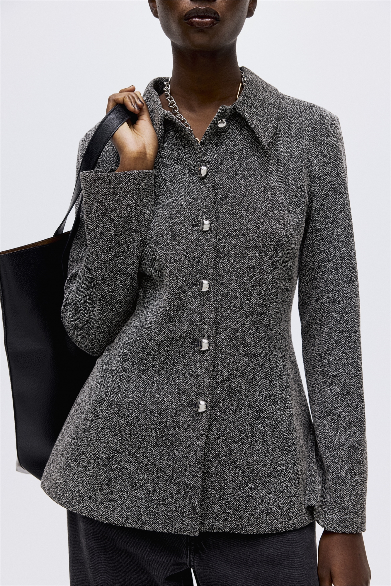 Жакет из жаккардового трикотажа с воротником и пуговицами спереди. Вытачки спереди для придания силуэту облегающего вида. Без подкладки.
