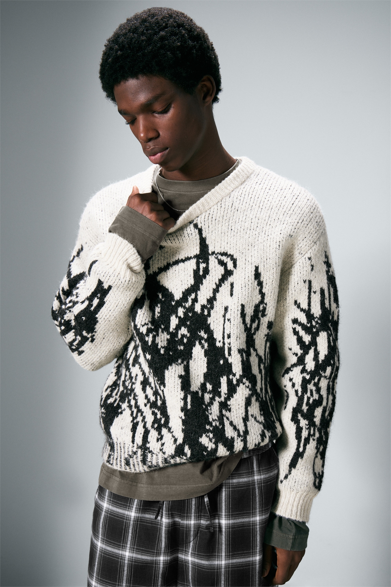 Вязаный свитер из мягкой шерстяной смеси с графическим рисунком. Классический вырез горловины, спущенные плечи, ребристая отделка горловины, манжеты и подол.