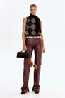 Брюки из мягкой кожи с заниженной талией, ширинкой на молнии и потайной застежкой на пуговицу и крючок. Скрытые боковые карманы, задний карман на пуговице и прямые ноги со швом на коленях и разрезом на подоле.