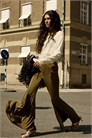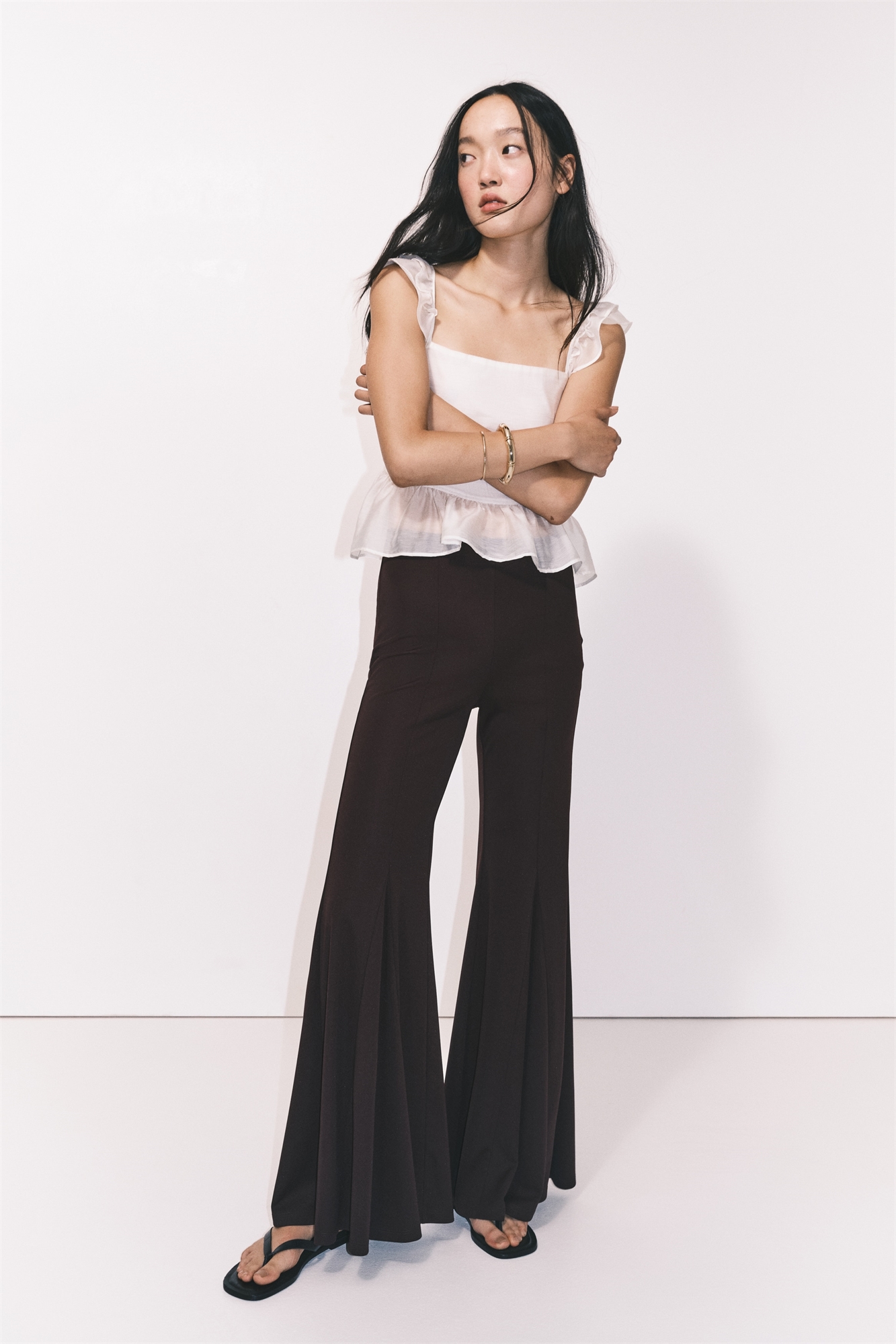 Брюки из мягкого трикотажа с высокой талией и скрытой эластичностью. Зауженный крой с видимыми швами спереди и сзади, заканчивающимися складками годе у колен, которые создают пышное расклешение к подолу.