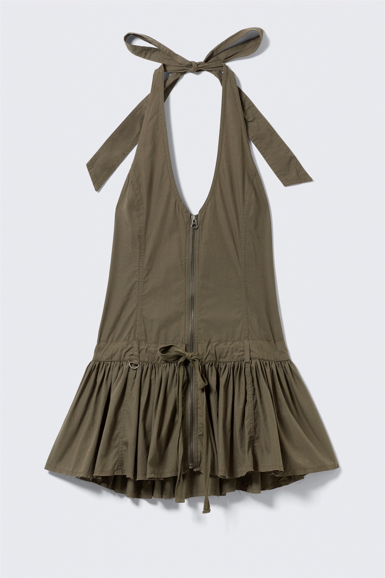Мини-платье без рукавов с приталенным лифом и расклешенной юбкой. Изготовленное из хлопка, оно имеет глубокий У-образный вырез, необработанный край подола и сборчатую юбку с завязками. Застежка-молния спереди, металлические D-кольца и широкие петли для ремня.