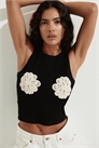 Приталенный топ из ребристого трикотажа с аппликацией на груди. Круглый вырез и прямой подол.