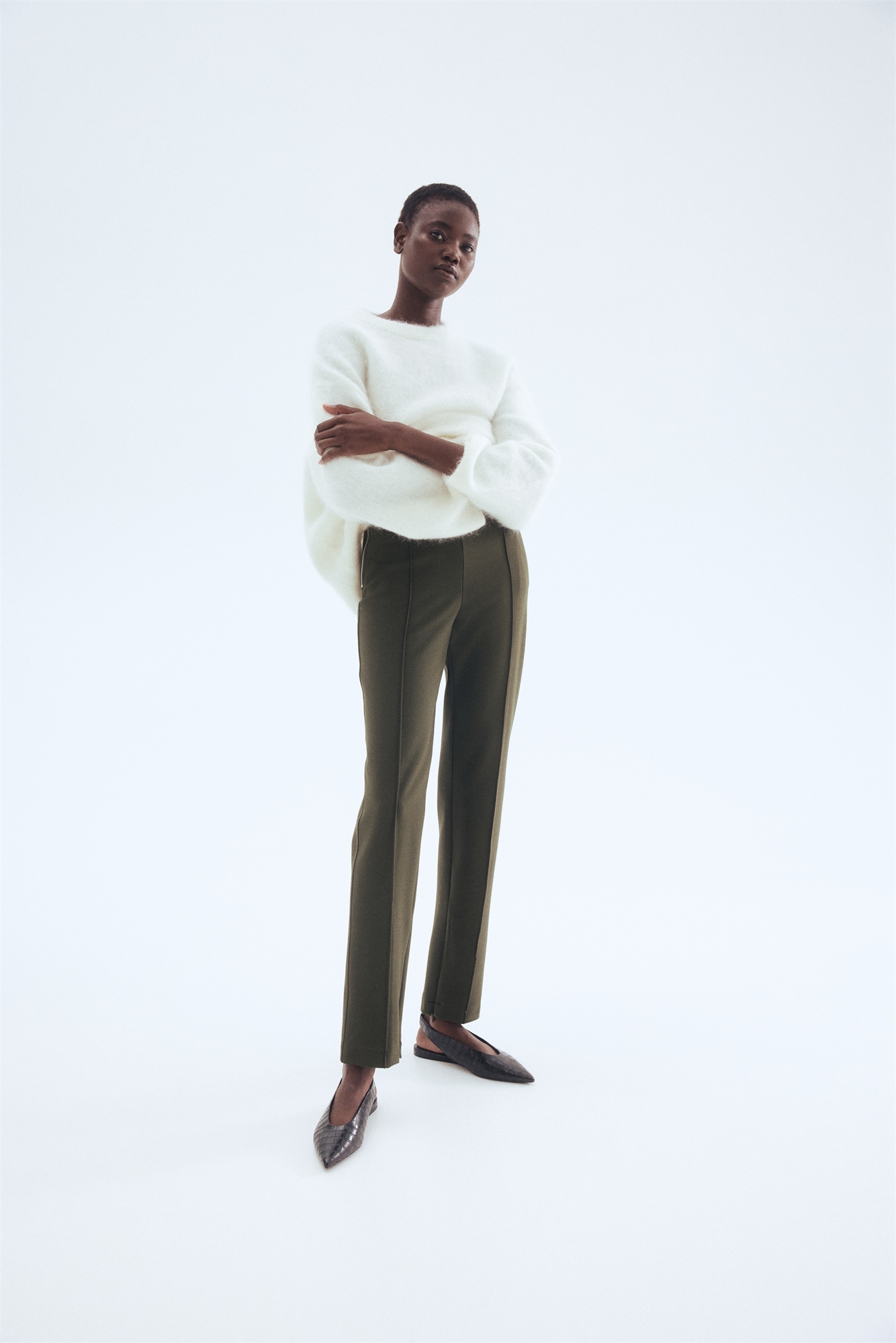 Облегающие брюки из плотного трикотажа интерлок с высокой талией со скрытой эластичной резинкой и боковыми карманами на молнии. Вшитые складки спереди и сзади и потайная застежка-молния по краям.