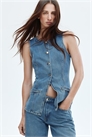 Приталенный жилет из жесткого денима, изготовленного из смеси хлопка и лиоцелла. Круглый вырез и металлические пуговицы до талии, создающие мягкий расклешенный крой от талии вниз. Поддельные накладные карманы спереди и формирующие швы спереди и сзади.