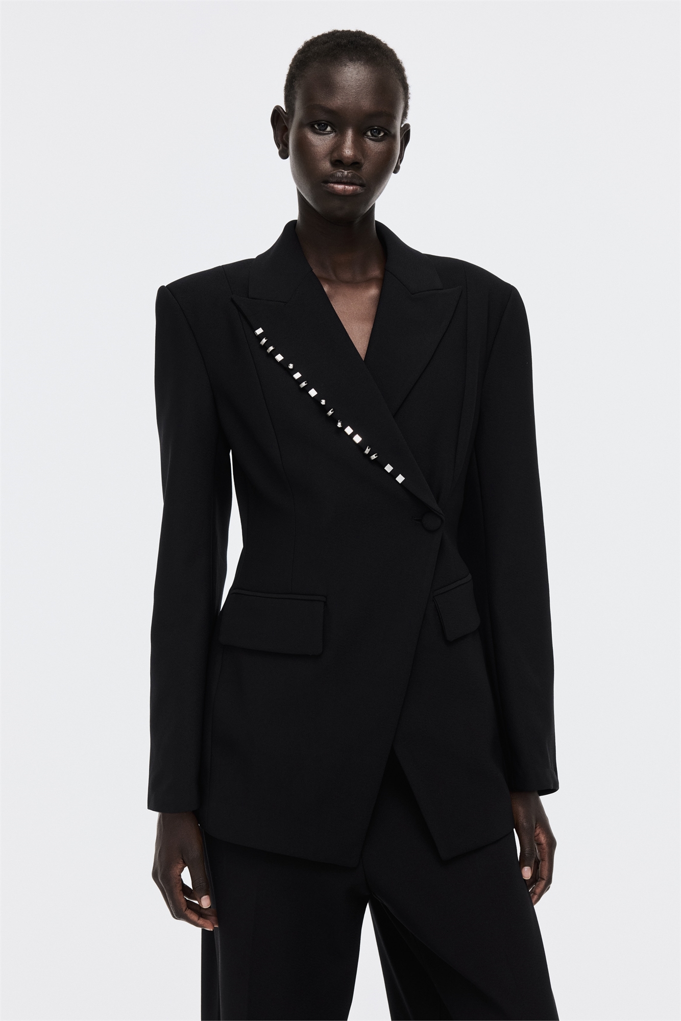 Двубортный блейзер из плотного крепового джерси с пикообразными лацканами, один из которых украшен металлическими заклепками. Смелые подплечники и заниженная талия создают силуэт "песочные часы". Одна закрытая и одна потайная пуговица спереди, прорезь и пуговица на манжетах. Передние карманы с клапаном и внутренний карман с кнопкой. На подкладке.