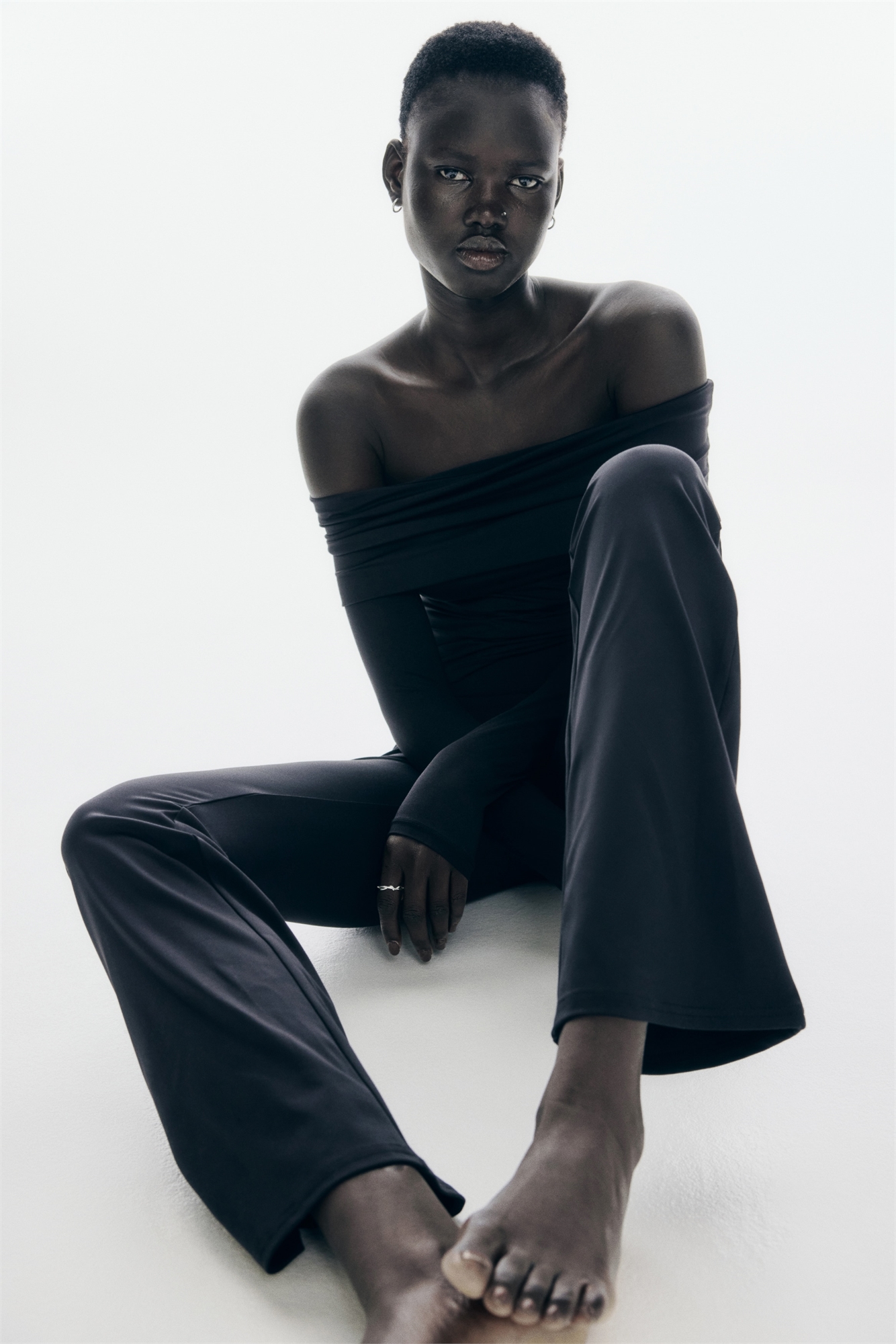 Облегающий топ без плеч из мягкого трикотажа с широким отворотом. Длинные рукава и прямой подол.