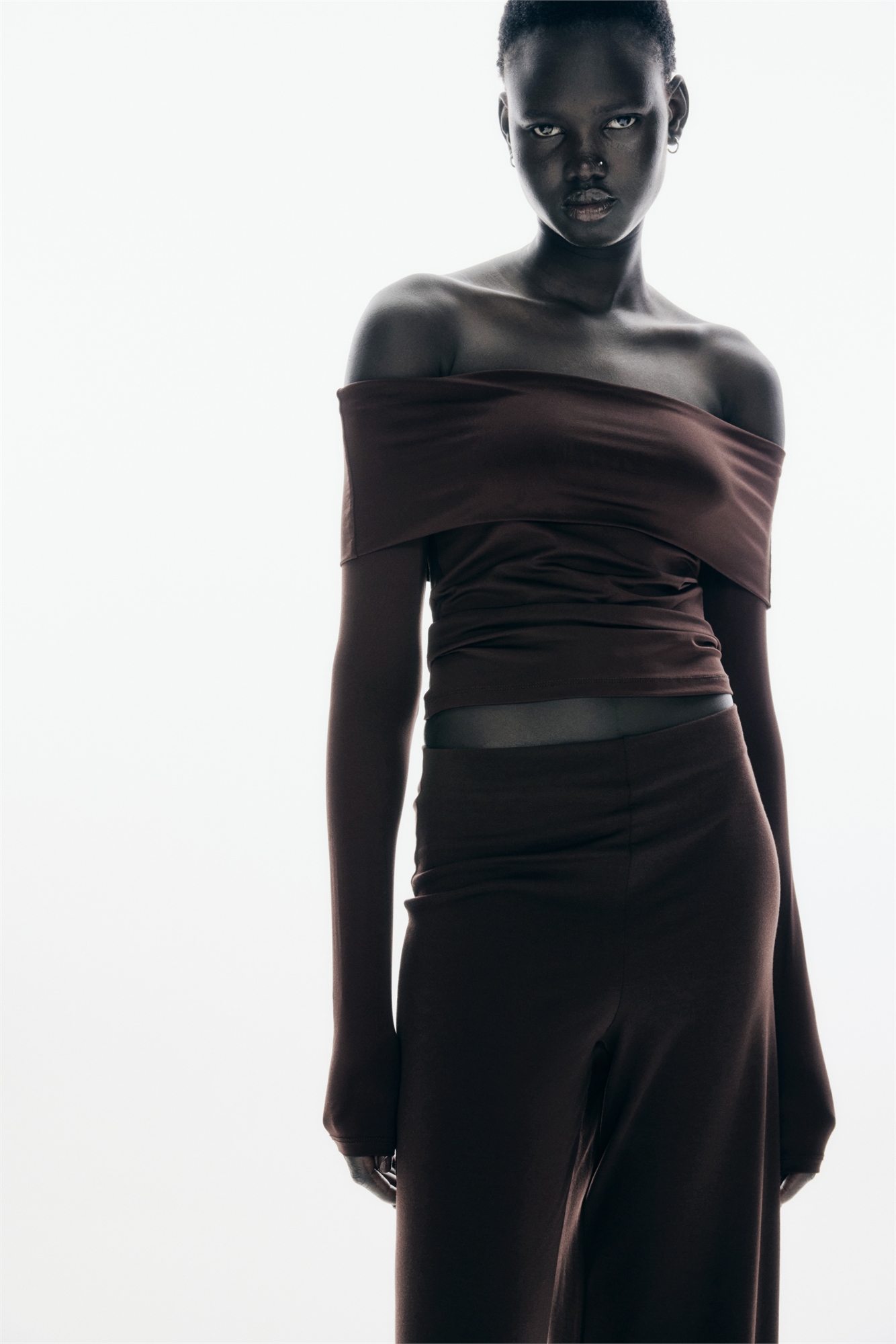 Облегающий топ без плеч из мягкого трикотажа с широким отворотом. Длинные рукава и прямой подол.