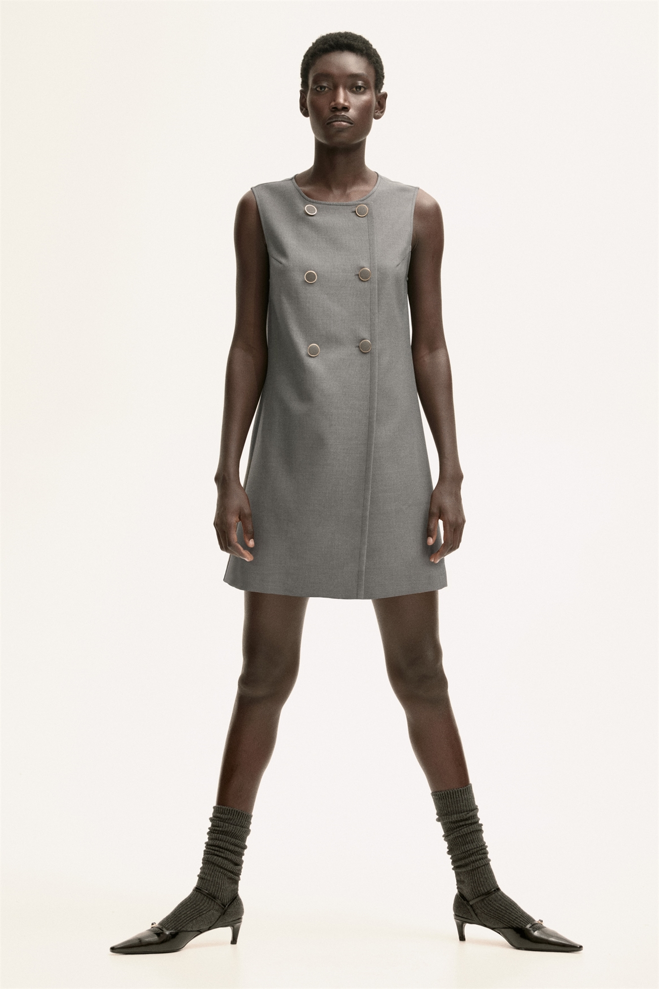 Короткое платье без рукавов из тканого материала с круглым вырезом и двубортным передом. Без подкладки.