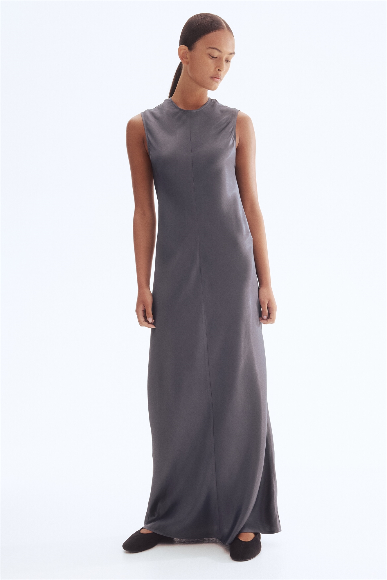 Длинное платье без рукавов из тканого материала с легким блеском. Круглый вырез и потайная застежка-молния сзади. Без подкладки.
