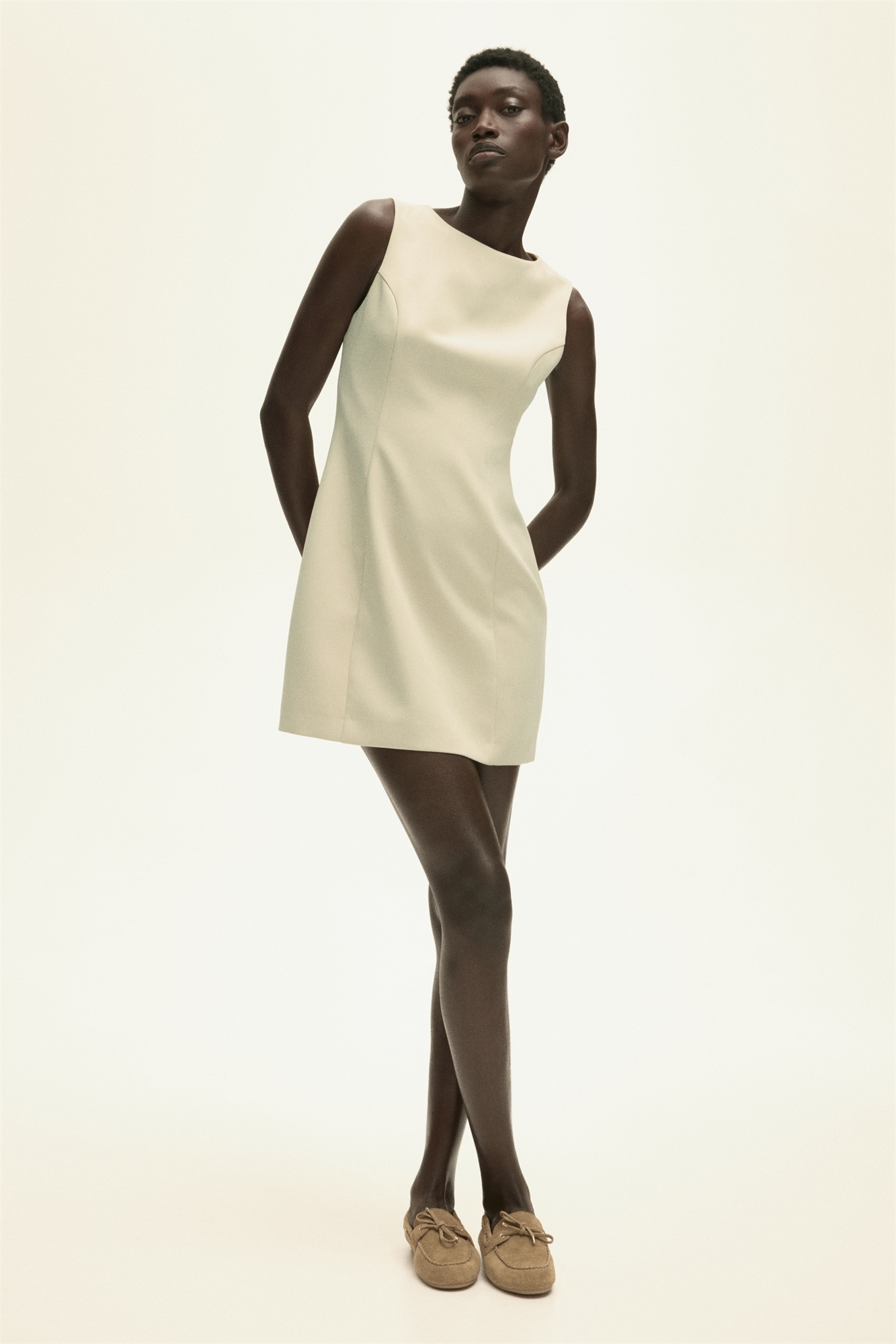 Короткое платье без рукавов из тканого материала с круглым вырезом и облегающим кроем с формирующими швами спереди и сзади. Потайная застежка-молния сзади. Без подкладки.