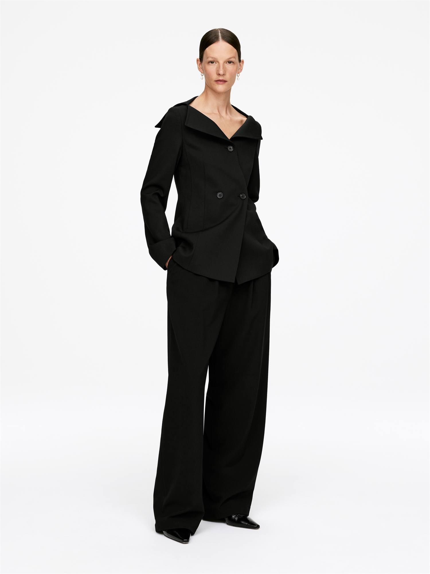 Блейзер с вырезом на плечах и застежкой на пуговицы, со скульптурной талией и небольшим количеством стрейча для комфорта. Этот фасон содержит 43% шерсти RWS (TE-00047206). Продукция, сертифицированная по стандарту ответственной шерсти (RWS), содержит шерстяное волокно с ферм, прошедших независимую сертификацию на соответствие требованиям по благополучию животных и землепользованию.