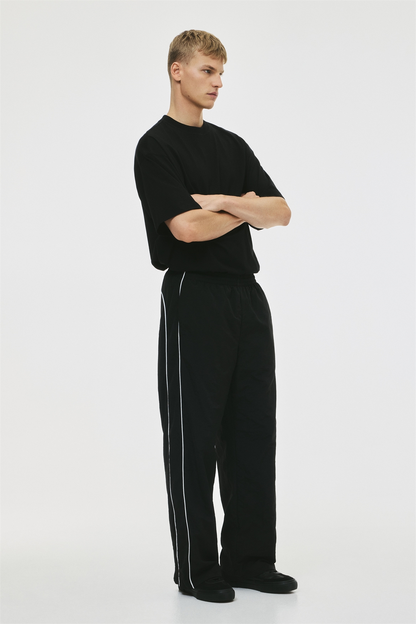 Спортивные брюки из гладкого нейлона с поясом на талии со скрытым шнурком. Карманы в боковых швах и контрастная отделка по ногам и сзади. Свободный крой для непринужденного, но не чрезмерного силуэта.