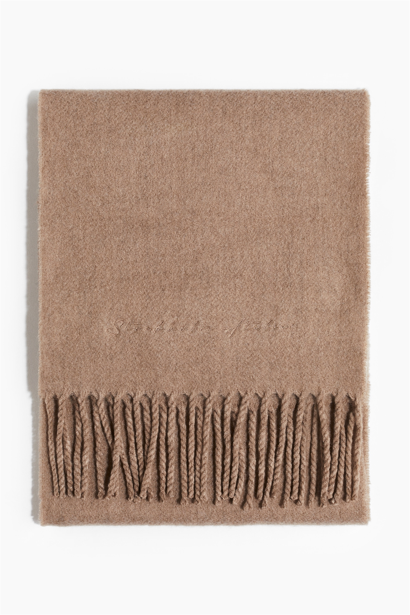 Шарф мягкого плетения с матовой отделкой и палубными краями. Вышивка с текстом в тон на одном конце и крученая бахрома по коротким сторонам.