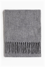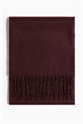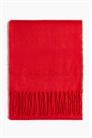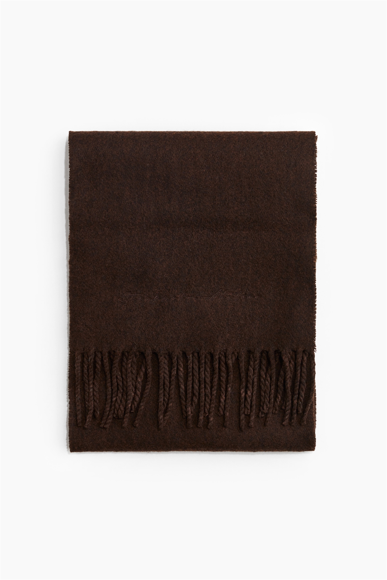 Шарф мягкого плетения с матовой отделкой и палубными краями. Вышивка с текстом в тон на одном конце и крученая бахрома по коротким сторонам.