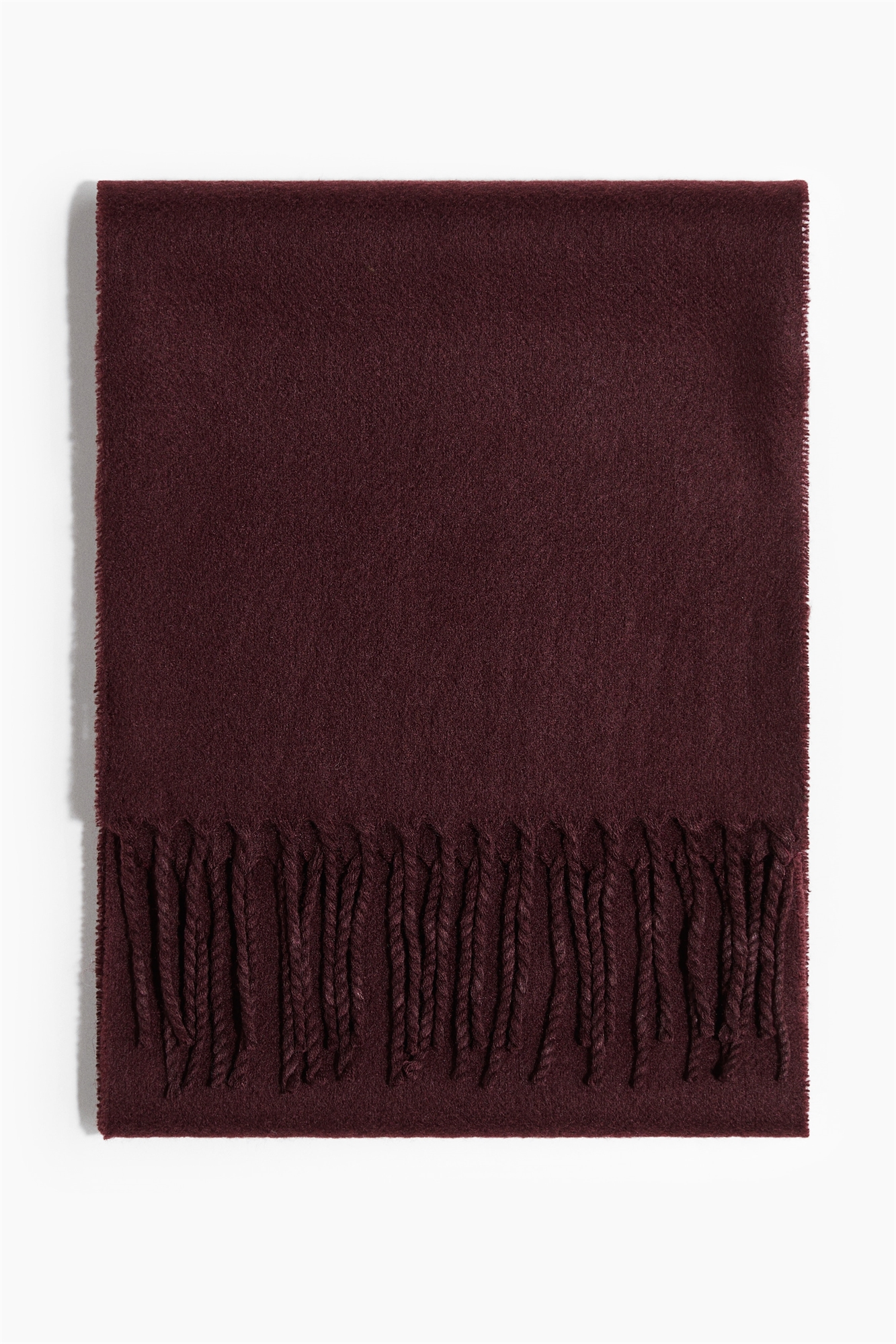 Шарф мягкого плетения с матовой отделкой и палубными краями. Вышивка с текстом в тон на одном конце и крученая бахрома по коротким сторонам.