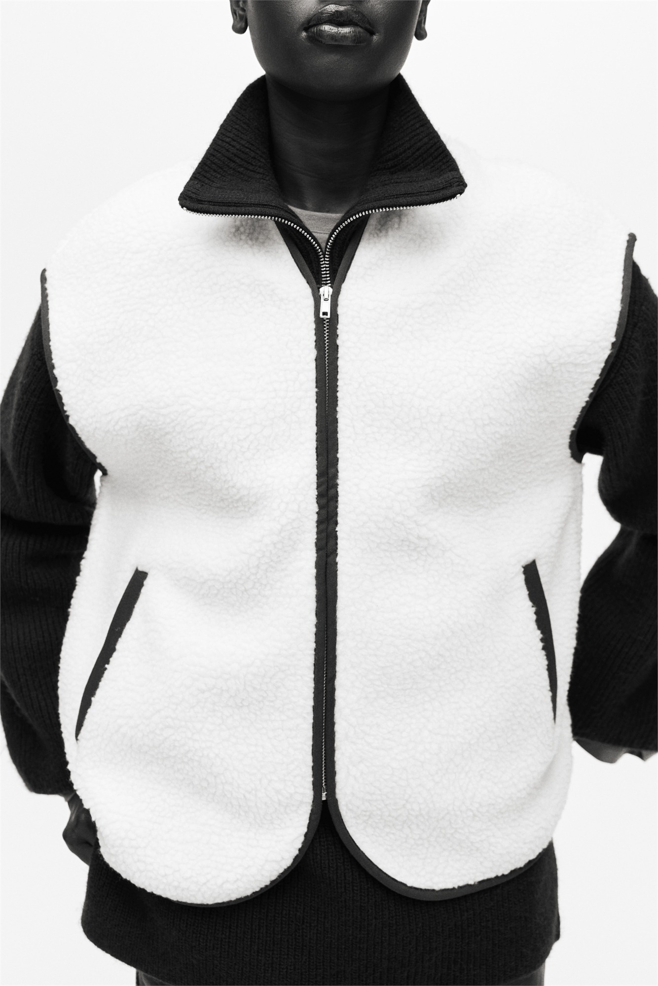 Жилет из мягкого тедди с переплетениями из тканого материала. Короткий воротник, V-образный вырез и диагональные прорезные карманы спереди.