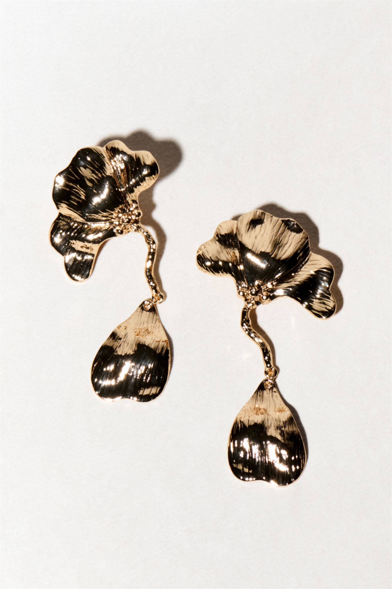 Серьги-подвески в форме лепестков из металла с фактурной отделкой.