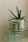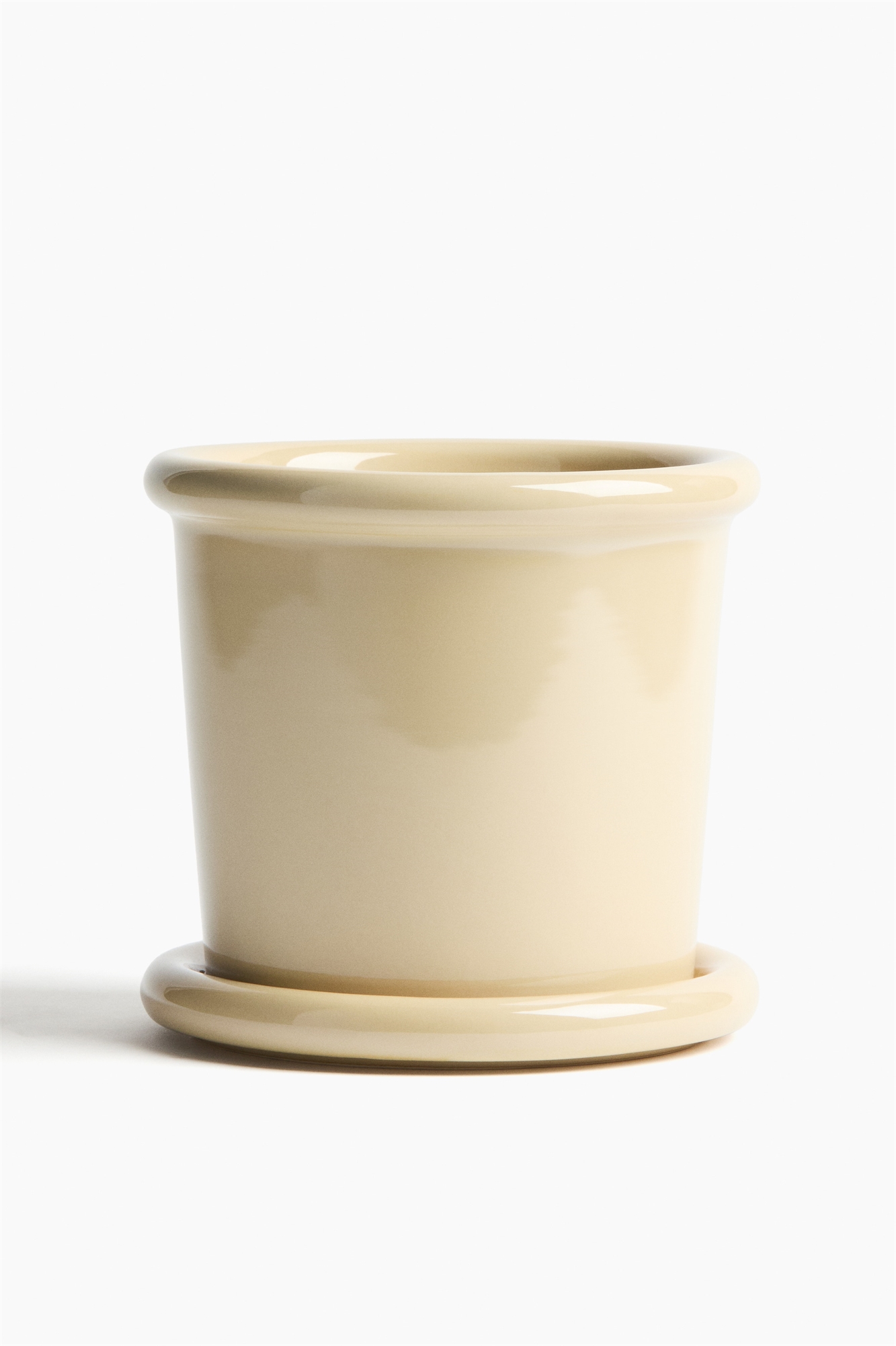 Горшок для растений из керамики с закругленным краем и подходящей подставкой.