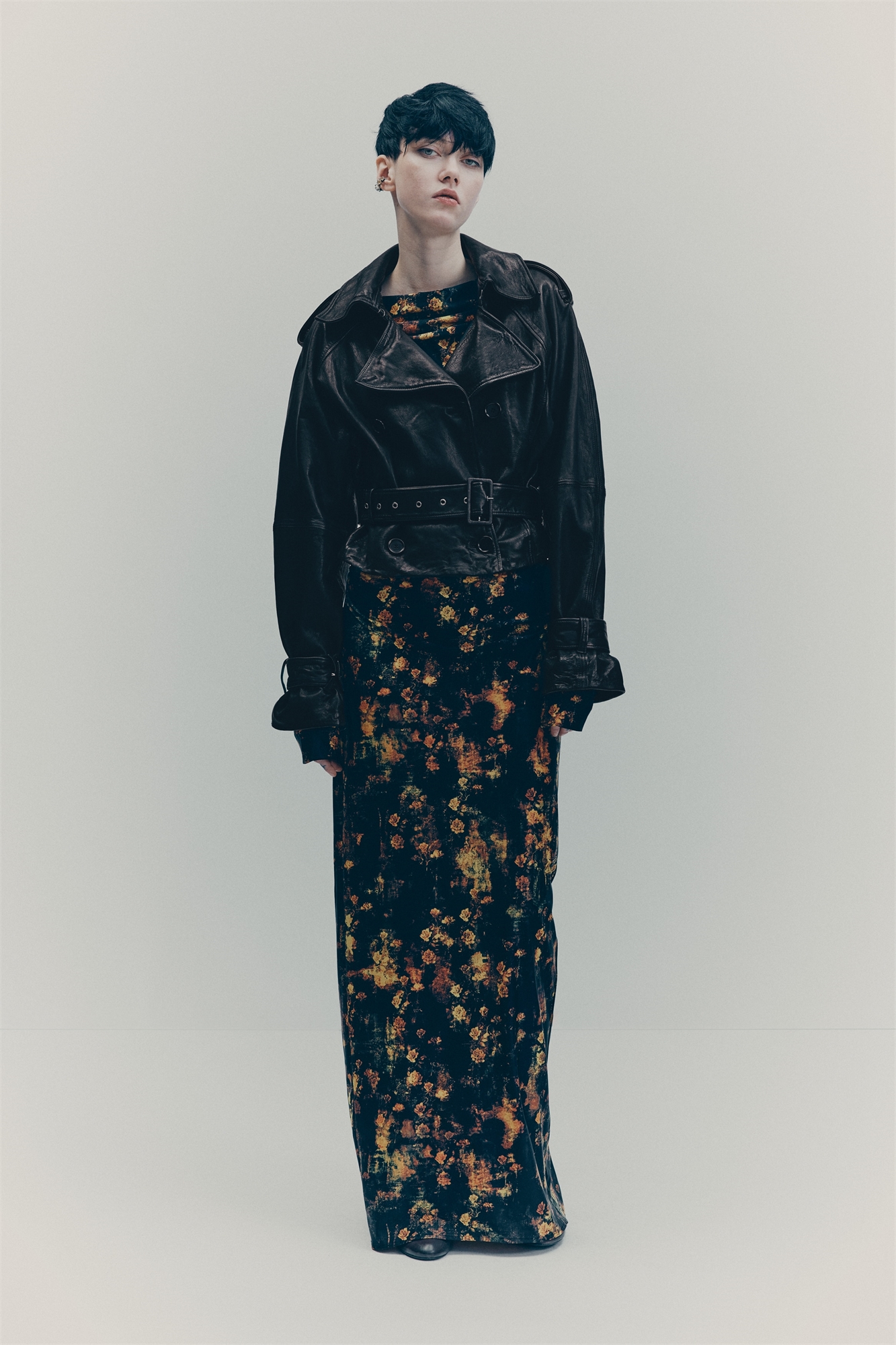 Короткая куртка из кожи с эффектом стирки, придающим ей мягкость и слегка потертый вид. Воротник, застежка на крючки и глазки в верхней части, двубортная передняя часть. Рукава реглан с погонами на пуговицах и регулируемыми манжетами на пуговицах. Незаметные боковые карманы и пояс с прямоугольной металлической пряжкой. Подкладка из саржи.