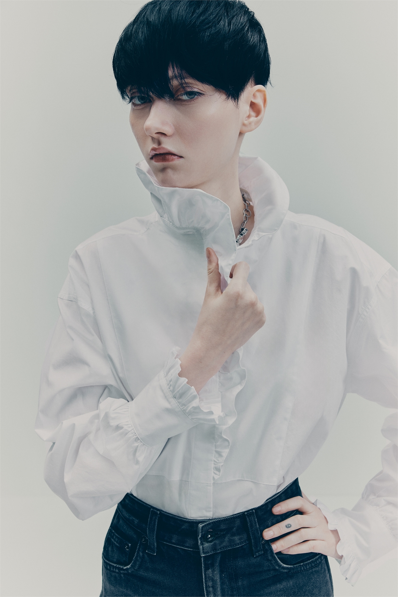Рубашка свободного покроя из хлопкового полотна с воротником-бантом с отделкой жабо, продолжающейся по верху пуговичной ленты. Двухслойный нагрудник спереди и сзади, спущенные плечи и длинные рукава с широкими манжетами с оборками, застегивающимися на пуговицы, и рукавная планка с пуговицей. Изогнутый подол.