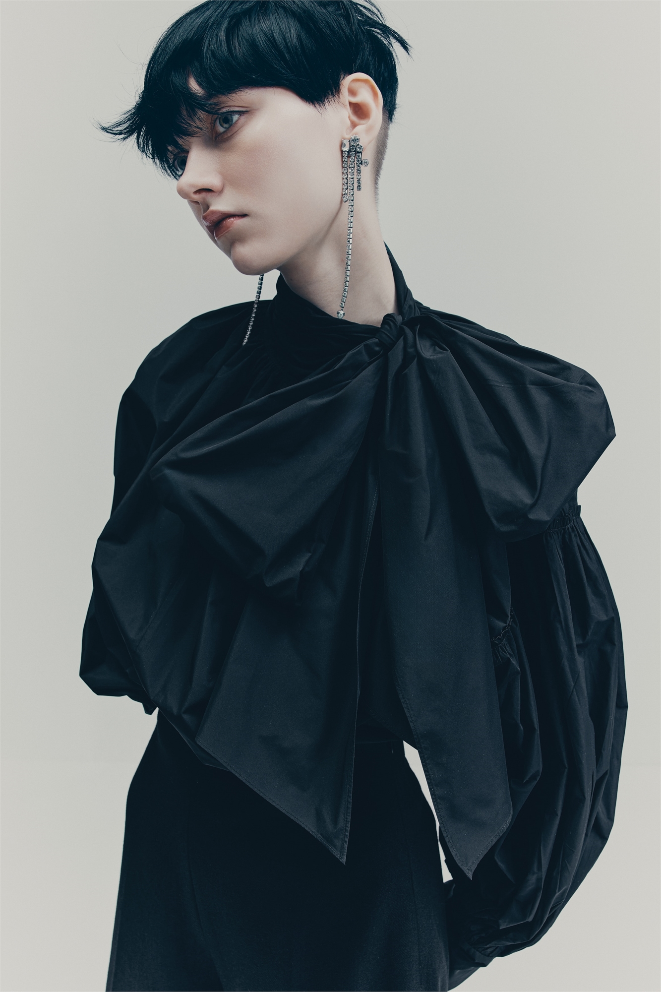 Свободная блузка из хрустящей легкой тафты с драпированным воротником-стойкой, переходящим в широкие завязки, завязывающиеся на большой бант спереди. Прорезь с пуговицей на одном плече, низко опущенные плечи и длинные рукава-шаровары с широкими расклешенными манжетами, отделанные прорезью и пуговицей. Подол стягивается шнурком с боковой завязкой. Все пуговицы имеют куполообразную форму и инкрустированы стразами.