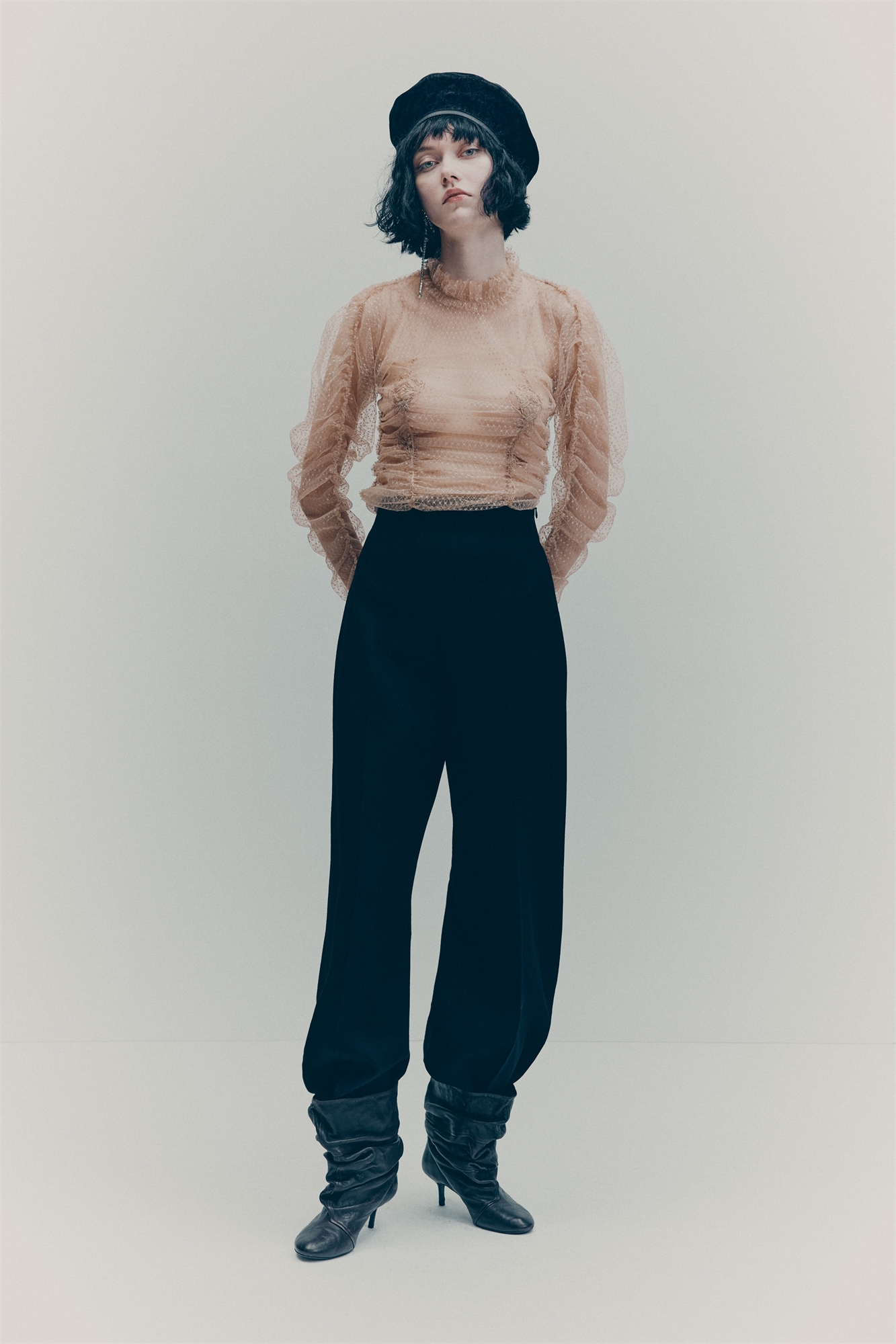 Облегающий топ из пятнистой сетки с вышитыми розами спереди и рюшами по всему шву для легкой драпировки. Отложной воротник с прорезью и пуговицей, украшенной стразами, сзади. Длинные пышные рукава с необработанными краями на манжетах и подоле.