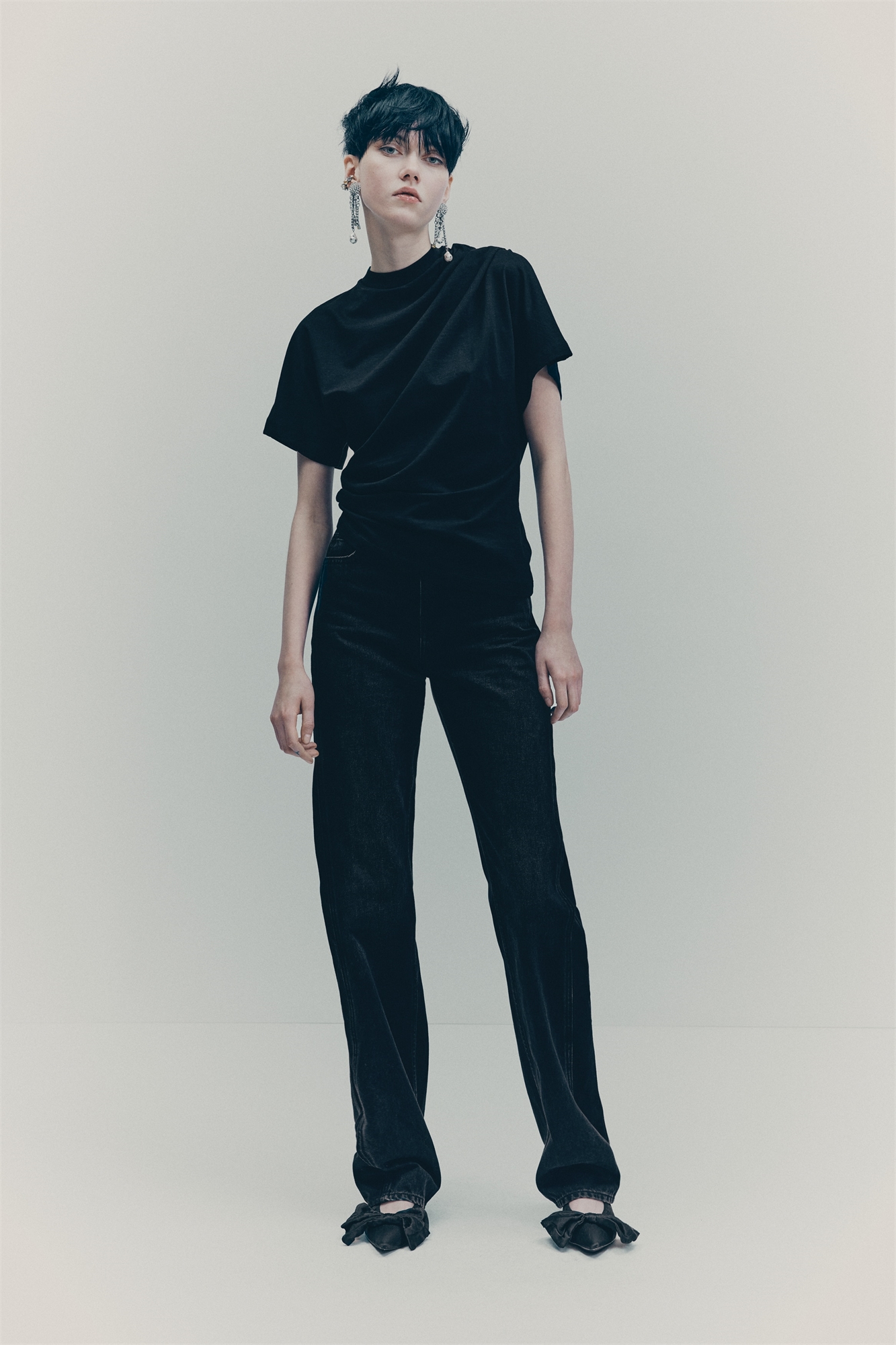 Облегающая футболка из хлопкового джерси с ребристой горловиной и складками на одном плече и противоположной стороне талии, создающими эффект неровной драпировки.