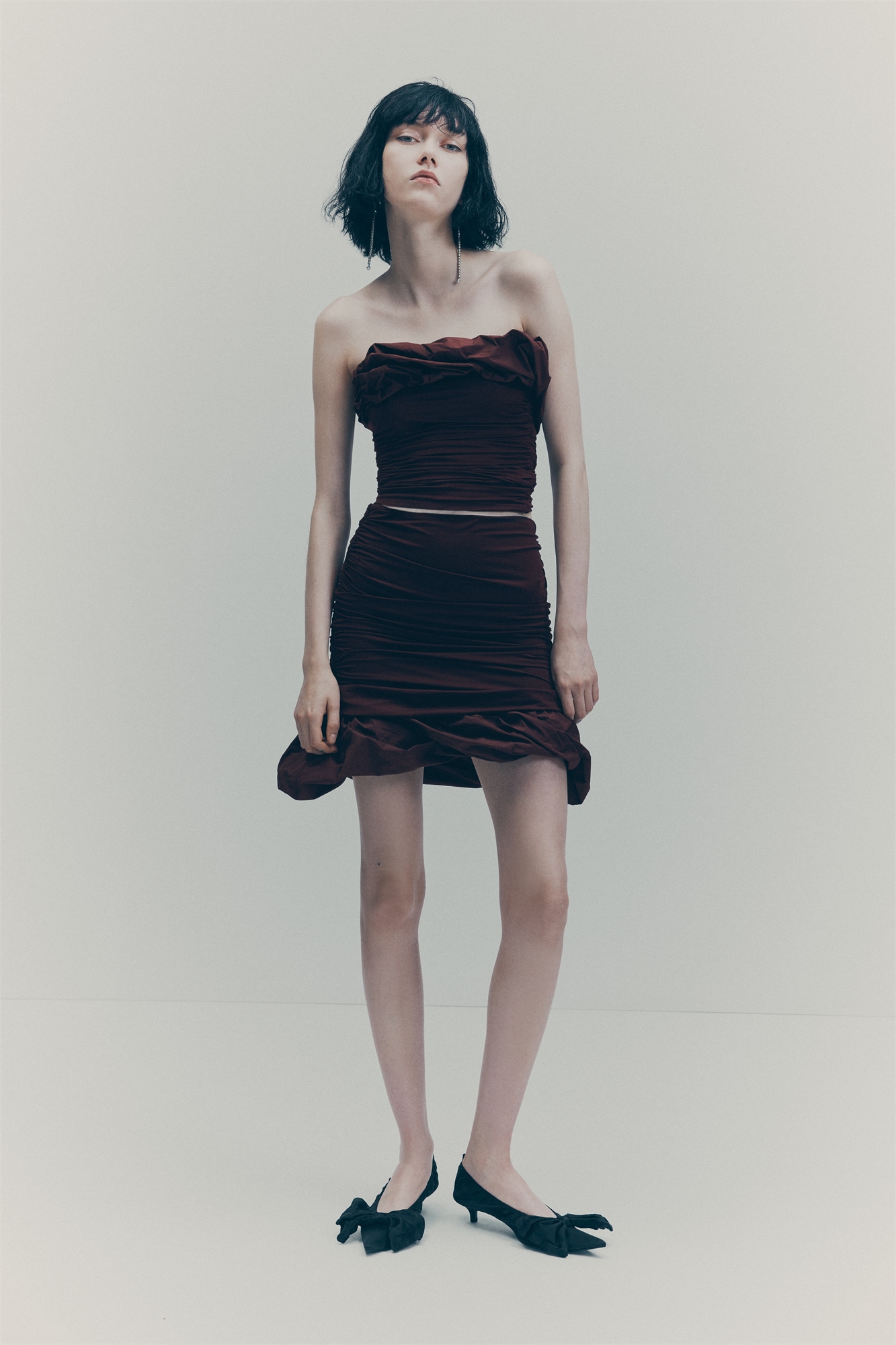 Короткая двухслойная юбка из стрейч-джерси с объемной рюшевой панелью из хрустящей тафты на подоле. Приталенный силуэт с эластичными складками по бокам, создающими эффект мягкой драпировки.