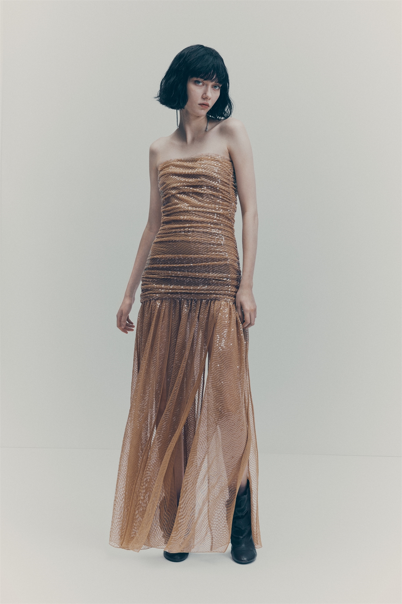 Вечернее платье в пол из сетки, украшенное вышивкой тон в тон в виде волнистого узора, дополненного блестящими пайетками. Лиф корсетного типа на сетчатой подкладке, скрытая силиконовая лента в верхней части, косточки для придания формы и поддержки, а также скрытая застежка-молния и застежка-крючок сзади для надежной фиксации. Обтрепанный край в верхней части добавляет тонкий контраст в образ, а собранные детали по бокам создают эффект мягкой драпировки. Модель дополнена юбкой из струящихся панелей с высокими разрезами между ними, придающими силуэту динамичность.
