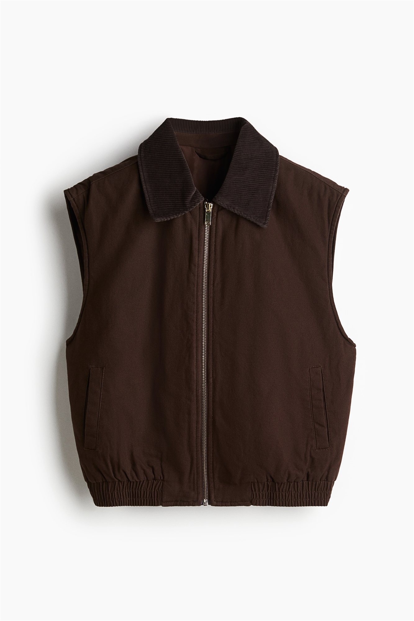 Жилетка с легкой подкладкой из хлопкового холста с вощеной отделкой и вельветовым воротником. Застежка-молния спереди, прорезные боковые карманы и приталенная резинка на подоле. На подкладке.