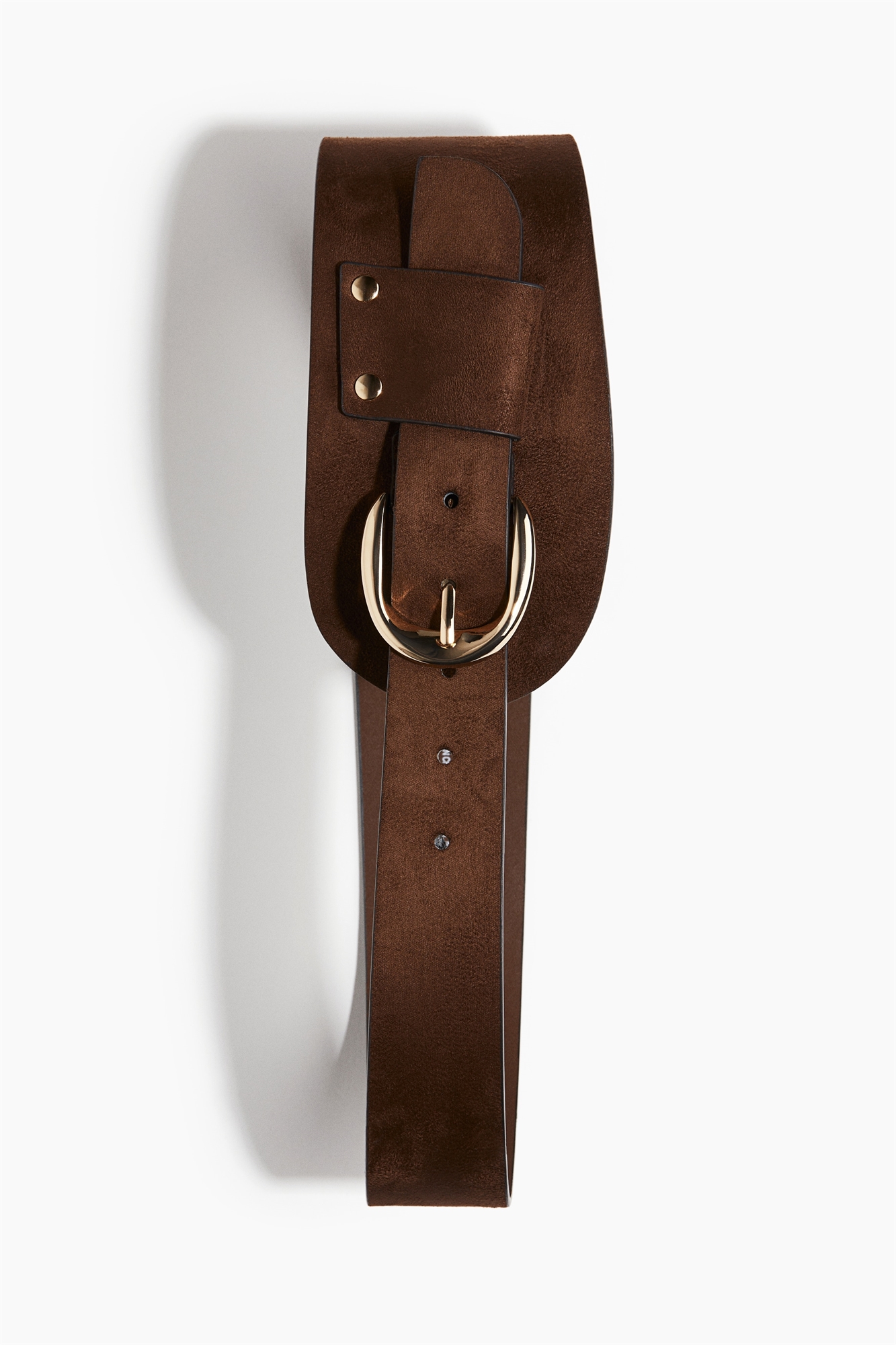 Широкий пояс с мягким ворсом и овальной металлической пряжкой.
