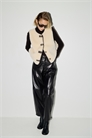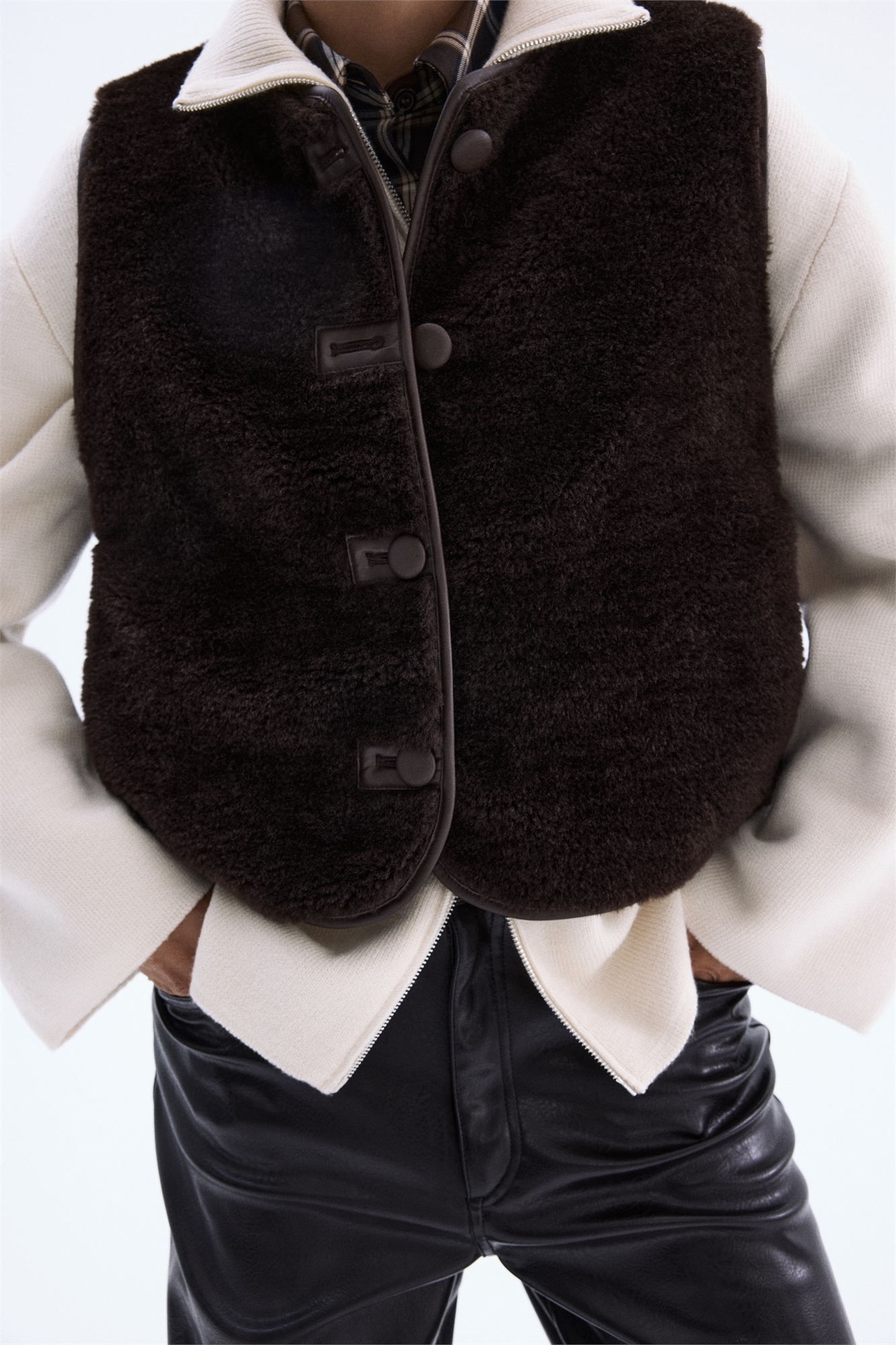 Жилет из мягкой, пушистой ткани с отделкой. Круглый вырез, пуговицы спереди и незаметные боковые карманы. На подкладке.