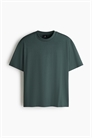 Футболка из хлопкового джерси средней плотности с круглым вырезом в рубчик, спущенными плечами и прямым покроем. Свободный крой для пышного, но не чрезмерно объемного силуэта.