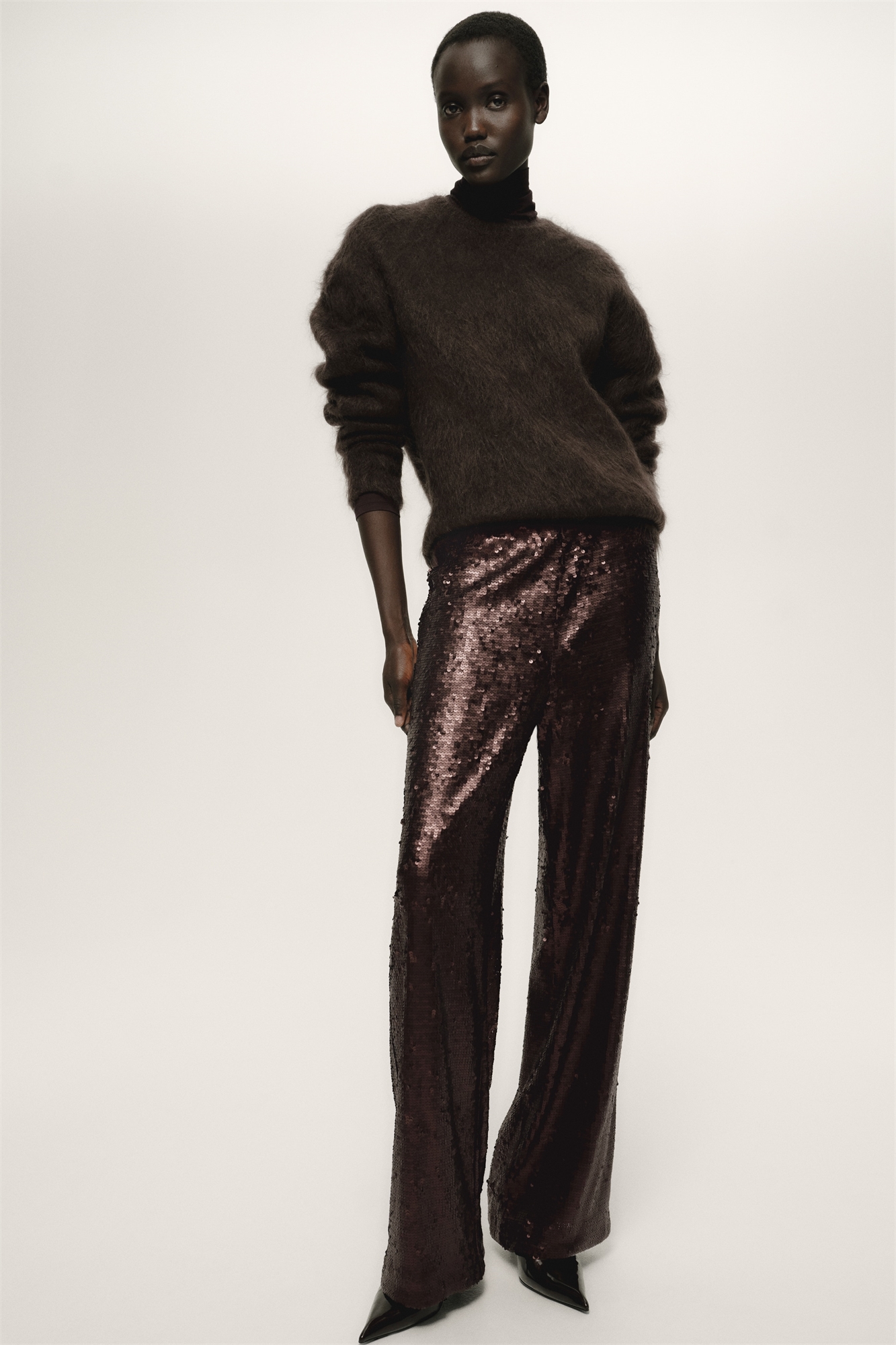 Брюки из сетки с блестками, с высокой талией, потайной застежкой на молнию с одной стороны и прямыми ногами. Подкладка из джерси.