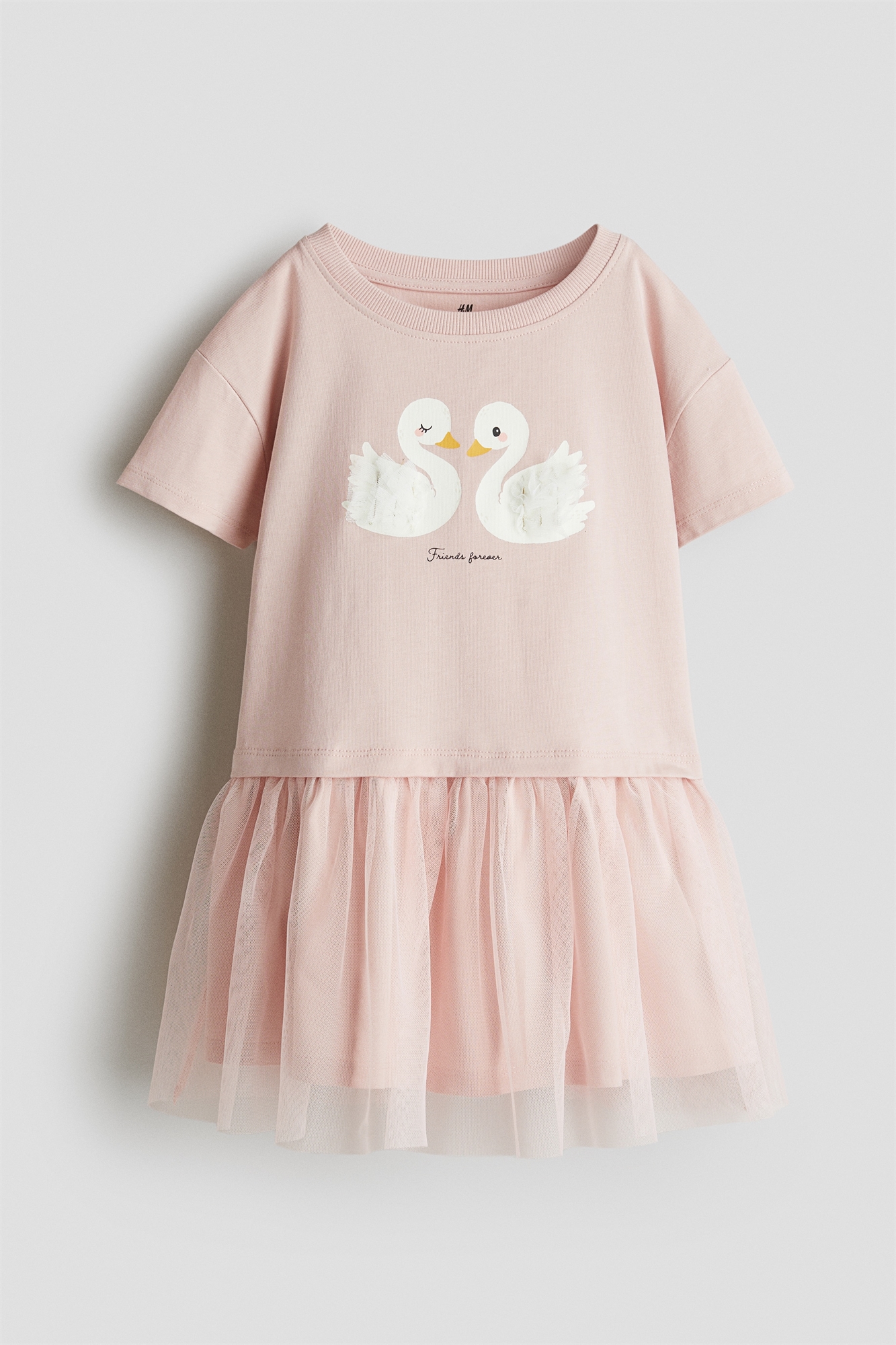 Платье из мягкого хлопкового джерси с принтом спереди и юбкой из тюля. Круглый вырез с ребристой отделкой, спущенные плечи и короткие рукава. Юбка на подкладке.