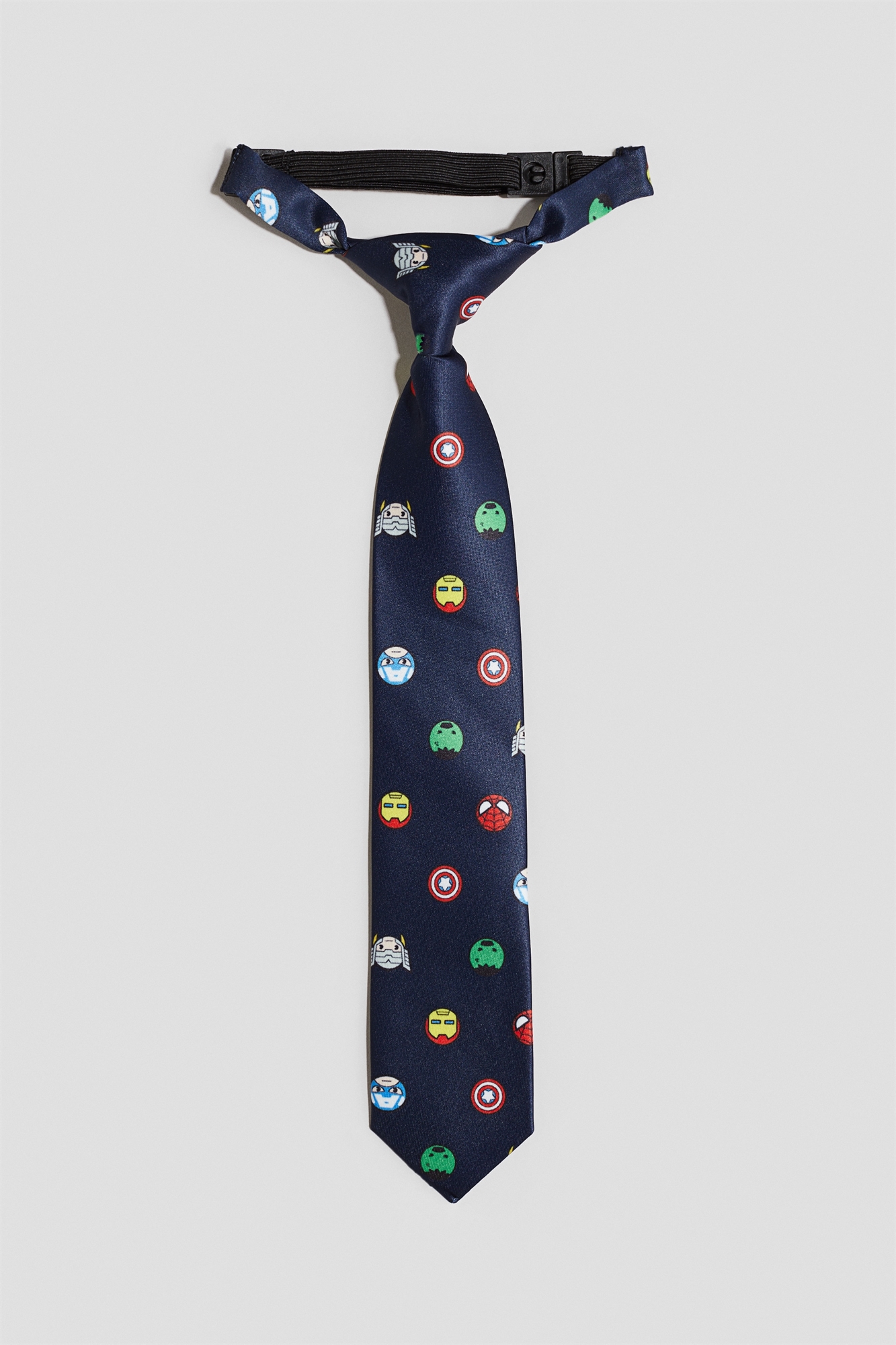 Завязанный галстук из мягкого набивного полотна с легким блеском. Регулируемый эластичный ремешок с пластиковой застежкой сзади.