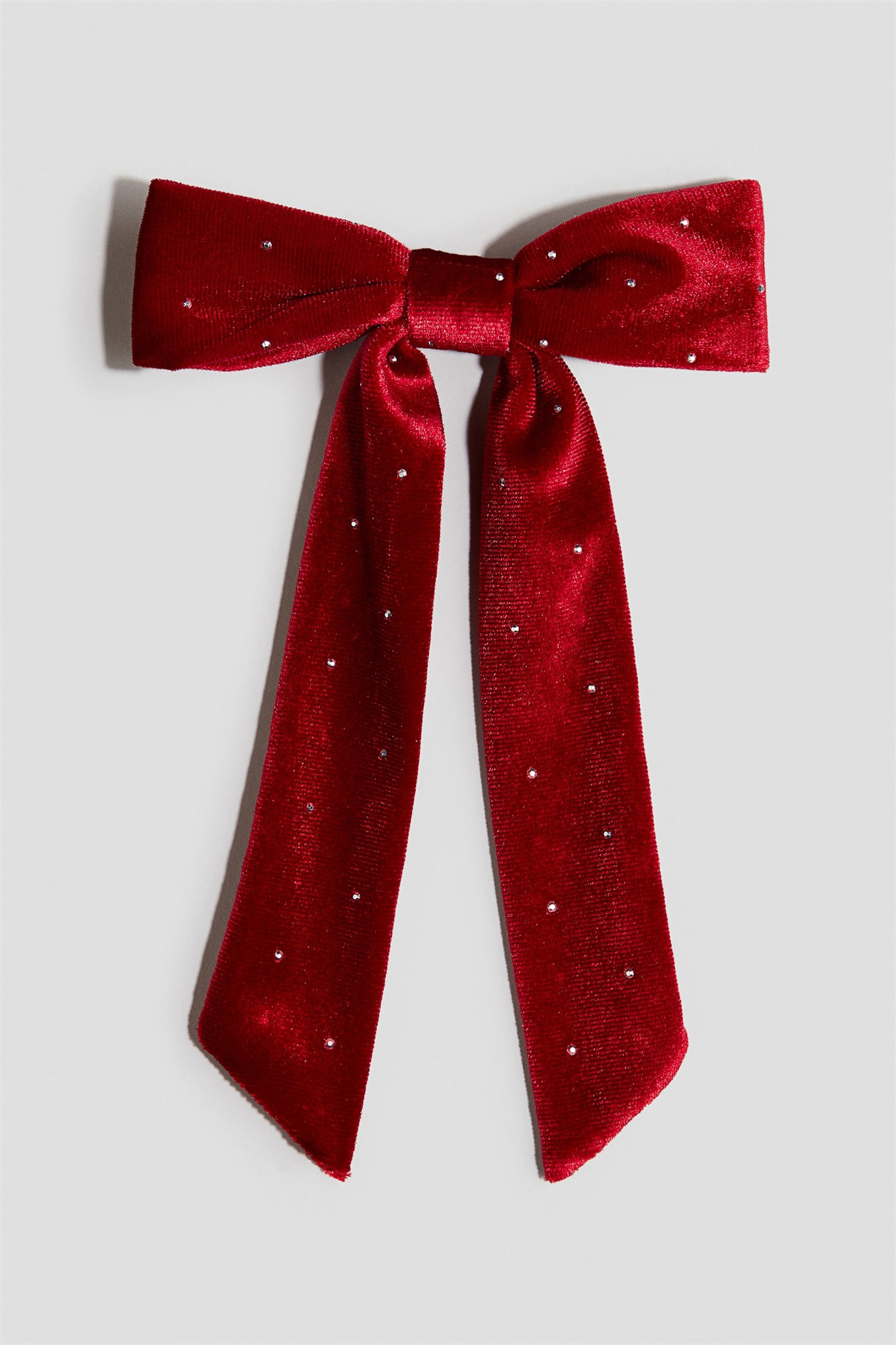 Металлическая заколка для волос, украшенная большим бантом из велюра со стразами.
